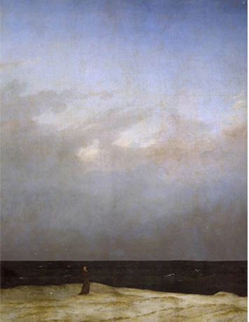 '해변의 수도승'의 배경이 되는 장소는 프리드리히가 자주 여름을 보냈던 발트해의 뤼겐섬 풍경이다. 일곱 살 때 어머니와 그 이듬해 누이를 잃은 프리드리히는 5년 후 함께 스케이트를 타던 형이 얼음 아래 빠진 그를 구하려다 익사하는 사고를 당한다. 뒤이어 또 다른 누이까지 사망하게 되니 프리드리히의 병적인 고독은 슬픈 가족사에서 출발했을 거다. 프리드리히의 작품에는 관객에게 등을 돌린 채 무한히 펼쳐진 자연 풍광을 바라보는 인물이 자주 등장한다. 대자연의 압도적인 존재 앞에서 인간은 보잘것없는 작은 존재로 느껴진다.