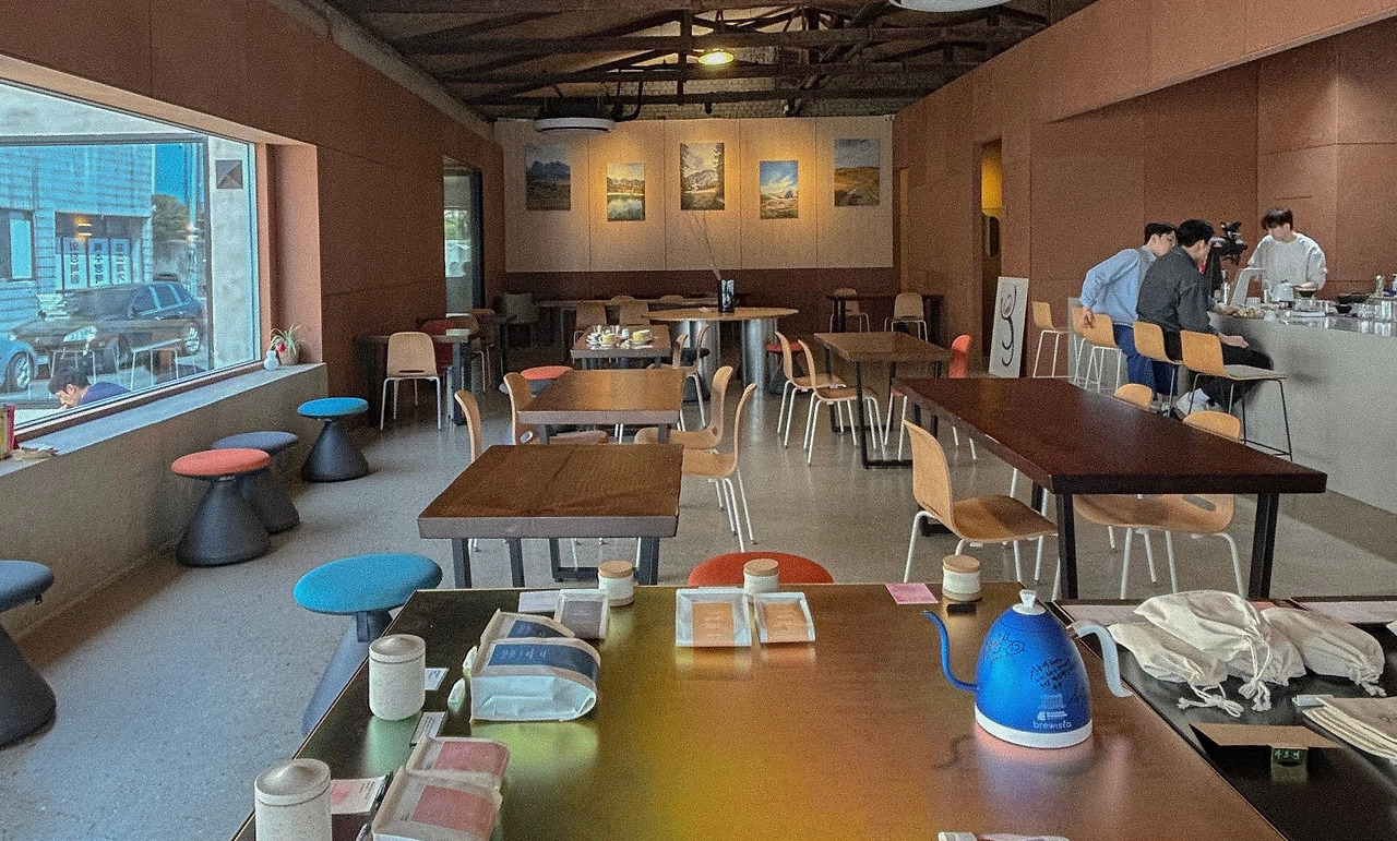 넓고 탁 트인 실내로 들어서면 가로로 넓게 커피를 내리는 곳과 바 테이블이 펼쳐져 있고, 그 앞으로 각기 다른 모양과 색상의 가구들이 놀랍도록 조화롭게 어우러져 있다.