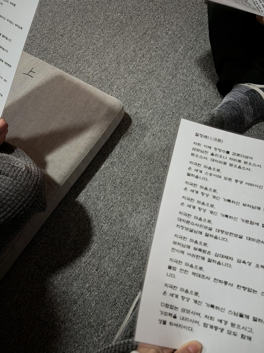 우리 조무래기들은 맨 구석에 일찍이 자리잡고 해석본을 읽고 있다 목탁 소리가 시작되자 따라서 절을 올리기 시작했다. 중간에 잠깐 돌아봤을 땐 스님들이 아주 많이 와계셔서 놀랐고, 왠지 그 존재만으로도 압도되는 듯했다.