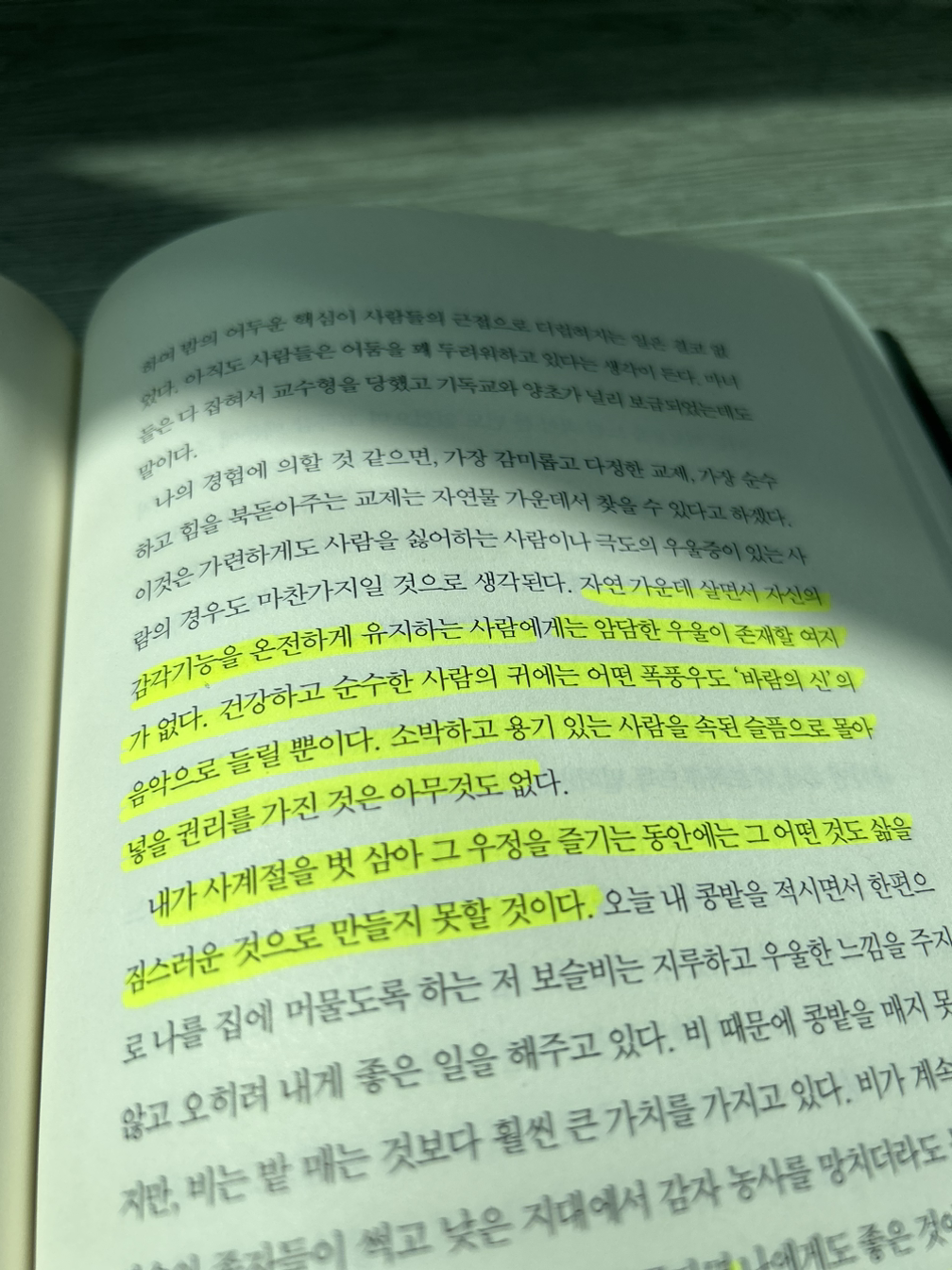 나의 경험에 의할 것 같으면, 가장 감미롭고 다정한 교재, 가장 순수하고 힘을 북돋아주는 교재는 자연물 가운데서 찾을 수 있다고 하겠다. 이것은 가련하게도 사람을 싫어하는 사람이나 극도의 우울증이 있는 사람의 경우도 마찬가지일 것으로 생각된다. 자연가운데 살면서 자신의 감각기능을 온전하게 유지하는 사람에게는 암담한 우울이 존재할 여지가 없다. 건강하고 순수한 사람의 귀에는 어떤 폭풍우도 '바람의 신'의 음악으로 들릴 뿐이다. 소박하고 용기 있는 사람을 속된 슬픔으로 몰아넣을 권리를 가진 것은 아무것도 없다. 내가 사계절을 벗 삼아 그 우정을 즐기는 동안에는 그 어떤 것도 삶을 짐스러운 것으로 만들지 못할 것이다.