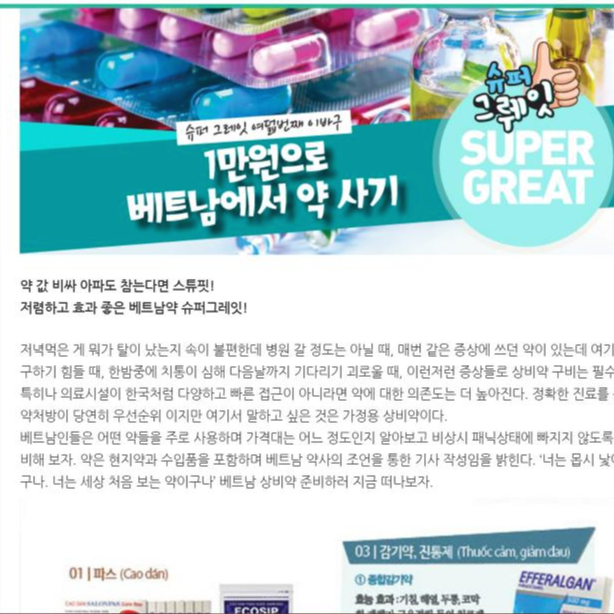 고민 끝에 이곳에서 발행되는 교민잡지 ‘씬짜오 베트남’을 찾아보았다. 약 소개가 있다. 약사가 기사를 쓴 것은 아니다. 교민들을 위해 ‘1만 원으로 베트남에서 약사기’ 제목으로 칼럼이 기고되어있다. 타지에서 비상시에 응급으로 해결할 수 있는 기본적인 약들이다.
