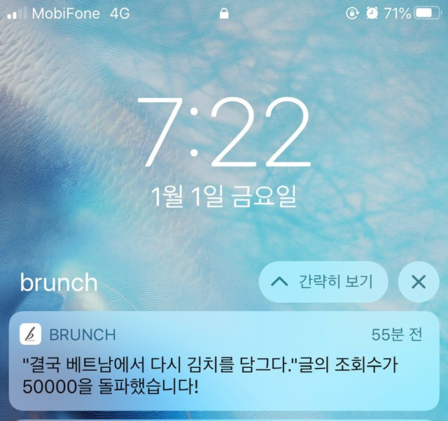 새벽 4시 30분. 새해에도 어김없이 울리는 알람. 순간 알람을 끄고 시간을 확인하다 하이킥으로 이불을 걷어차고 앉았다. 사방이 깜깜한 새벽 4시 30분. 간밤에 브런치로부터 많은 메시지가 도착했다. 어제저녁 1000 돌파가 끝이 아니었어? 도대체 이게 지금 무슨 일인고 하니 4천을 돌파했단다. 무슨 소리야? 오전 5시, 8천을 돌파했다고 알람이 울렸다. 어라? 그 '김치 담근 이야기가?’ 어흐이~ 얼토당토 없이, 뜬금없이 갑자기 김치 담근 스토리가 2021년 1월 1일 새해에 느닷없이 8천을 돌파했다고?' 가슴이 콩닥콩닥 뛰었다. 브런치로 돌아와 혹시 오타는 없는지, 이상한 문장은 없는지 두 눈을 뜰 수 있는 만큼 최대한 크게 뜨고 읽기를 반복했다. 글쓰기 실력이 발바닥 수준이라 도저히 못 찾아내겠다. 포기하고 그냥 덮었다. 그런데.. 계속 메시지가 날라 왔다. 쥐구멍에라도 숨고 싶었다. 동시에 팔딱팔딱 뛰고 있는 나의 심장 소리에 귀를 기울였다. 살아 있는 소리였고 현재 살고 있다는 심장의 소리였다. 부르르 떨림이, 전율이 발끝부터 머리까지 타고 올라와 어느새 눈이 흐릿해지며 갑자기 눈물이 앞으로 확 쏠렸다. 손으로 후다닥 훔쳐 내렸다. 아침 시간이다. 상황 파악은 안 되지만 난 시간의 주인, 하루의 주인 되기 위해 감정은 우선 뒤로 밀쳐냈다. 6시에 무이네로 출발해야 한다.