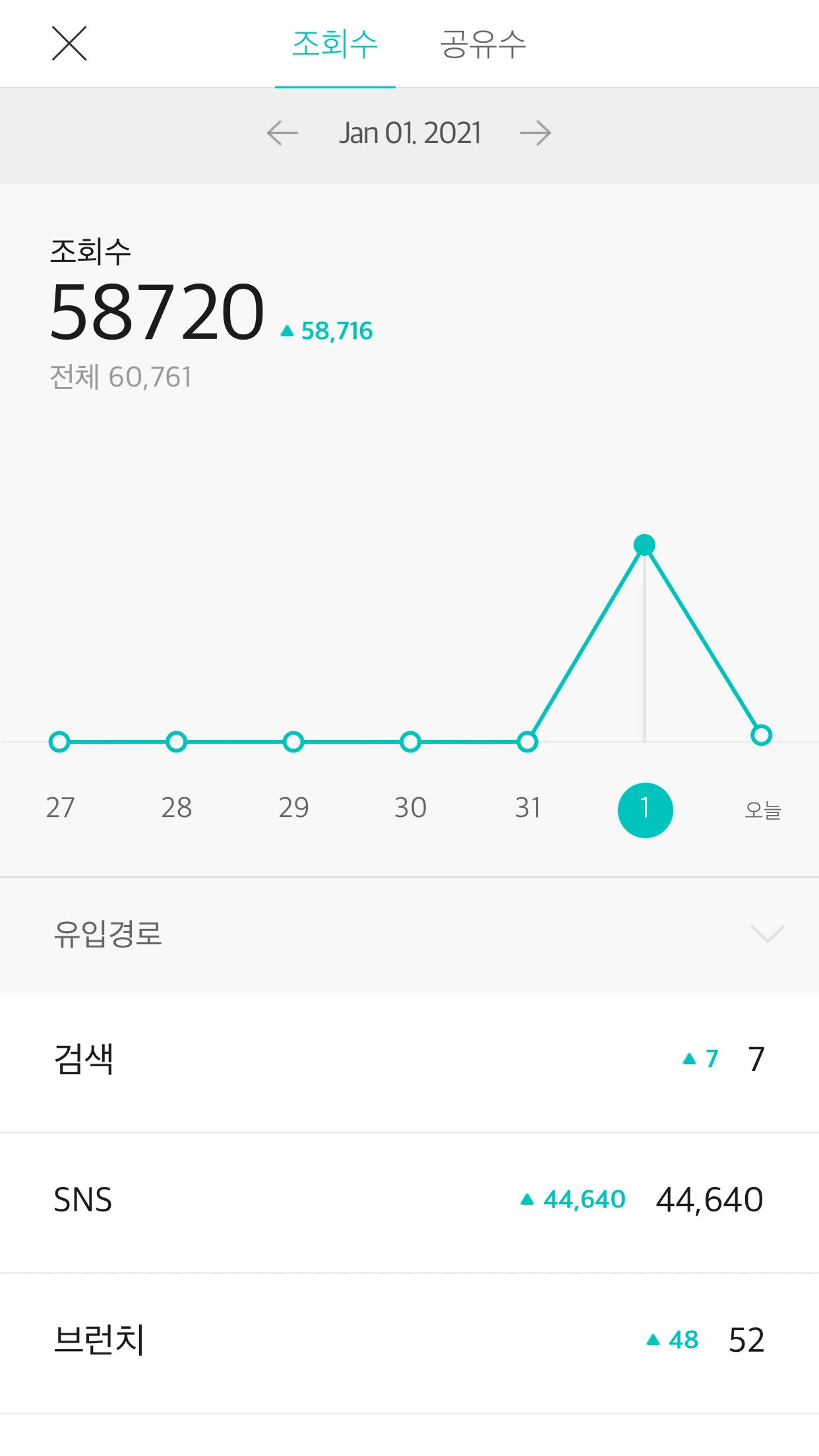 얼떨떨한 일이 생겼다. 노안으로 최대한 눈을 가냘프게 뜨고 봤다. 이제는 눈을 크게 버럭 뜬 체 글자를 보면 글자가 퍼질 때로 퍼져 읽을 수 없다. 글씨가 흐릿하니 초첨이 흐트러진다. 다시금 게슴츠레 실눈을 뜨고 확인했다. 조회수 1000을 돌파했습니다. 12월 31일 저녁 10시 40분 호치민 시각. 잘 준비를 마치고 포근한 침대에 지렁이처럼 쓱 몸을 밀어 넣었다가 런닝과 속옷 바람으로 후다닥 남편에게 달려갔다. 온몸에 세포가 쭈삣 쭈삣 되살아 나는 듯했다. 거실에서 오락 프로를 보던 남편이 무슨 말이냐고.. 왜 또 호들갑이냐고...