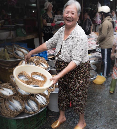 저 뒤쪽에 위치해 있는 해산물 가게를 향해 빠른 발걸음으로 많은 가게들을 가로 질러간다. 한국 마담 4명이 새벽부터 졸래졸래 움직이니, 시장 상인들 시선 집중은 너무나 당연한것이고, 그들도 우리를 보고선 안다. 여행객이 아니라는 사실을. 14여 년 전 이곳에 외국인 거주자가 지금처럼 넘쳐나지 않았기 때문에 어딜 가나 우린 슈퍼 스타. 왜소한 베트남 살람들 덩치에 비해 우리는 컸다. 아무리 가냘픈 여성이라도 생김새와 피부톤이 다른 탓에 쉽사리 눈에 띄었다. 베트남 문화 특징상 외국인에게 관심이 많고 호기심이 많아 실실 웃으며 말을 거는 사람들도 많다. ‘응어이 한꾸억?’ (한국사람?)하면서 말이다. 어찌나 다들 노골 적으로 버젓이 쳐다보시는지. 민망할 정도이다.