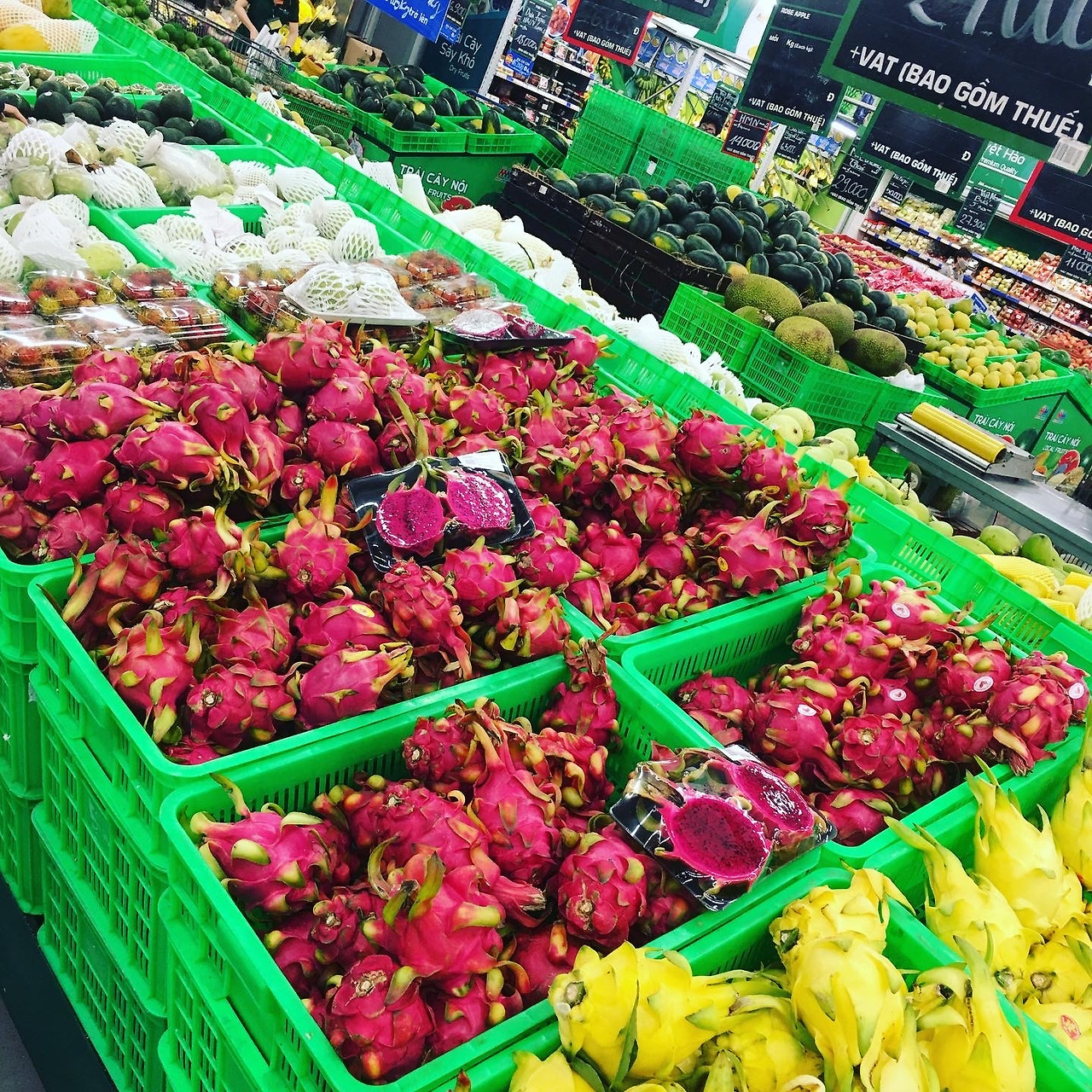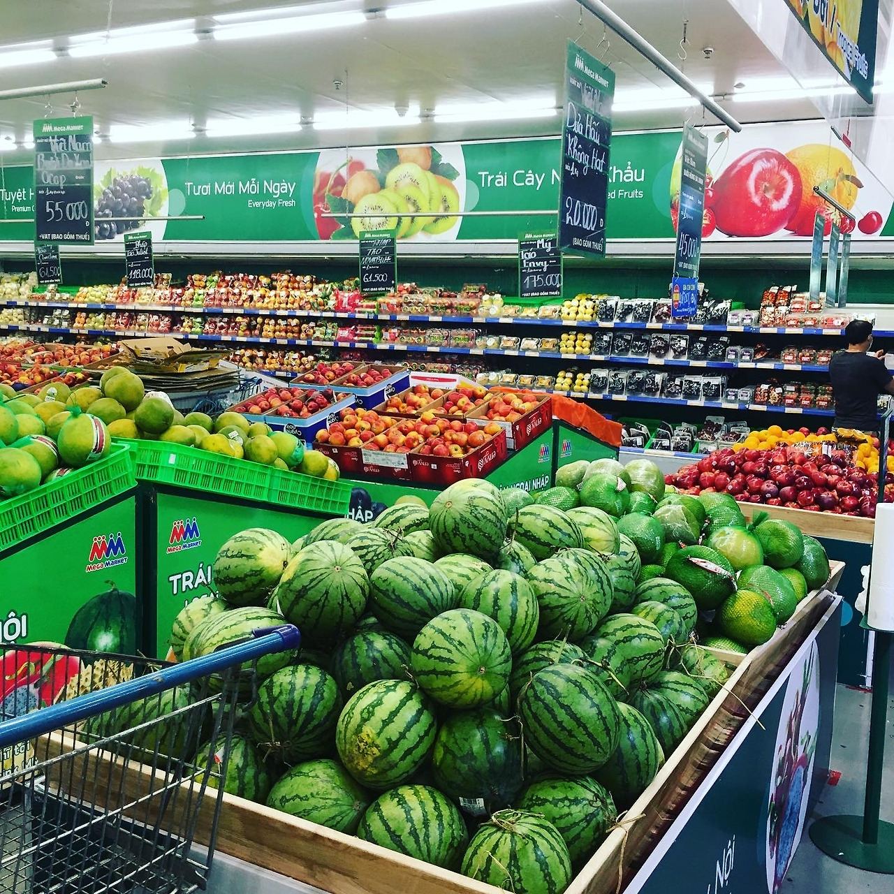 화요일 보단 수요일 장을 보면 튼튼한 야채 과일 박스에서 매장 소쿠리로 옮겨 놓은 싱싱하고 큰 야채들을 구매할 수 있다. 특히 과일의 경우, 상처 하나 없이 영걸은 굵고 맛있는 사과와 수박을 살 수 있다. 그리고 다시금 토요일이 되면 최상의 물건들이 진열대를 꽉 채운다. 정말 최고의 상품들이다. 마트 순환을 알아내기까지 열심히 요일 별로 마트를 다니며 체크를 해 보았다. 한 동네 마트에 공급하는 업체가 비슷비슷하다는 것을 알게 되었고, 마트마다 납품하는 상품의 등급이 다르다는 것도 알게 되었다. 지금도 여전히 최고의 과일은 Nam An (남안)과 Anh Nam(안남 고메)에서 취급한다. 이곳은 과일을 고를 필요도 없다. 전부 다 싱싱하고 달콤하고 상큼하다. 하지만 가격은 5프로에서 10프로 정도 더 비싸다.