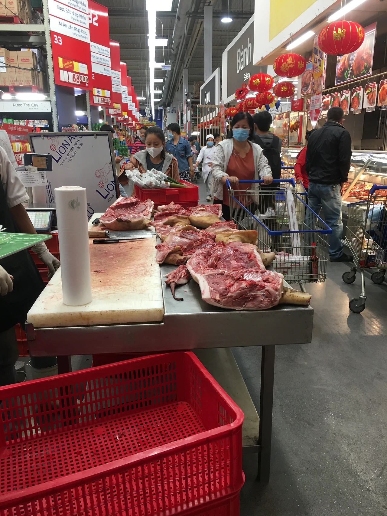 요즘 고기를 로컬 현지 정육점처럼 돼지 한 마리, 소 한 마리를 매장 한가운데 스탠 테이블 위에 떡 하니 올려놓고, 그 자리에서 원하는 부위를 소량씩 절단해서 판매한다. 충격이었다. 소상이 발달한 베트남 로컬 시장에서 주로 볼 수 있는 풍경이다. 냉장고 없이 그냥 나무 도마 위에 펼쳐 놓고 그날 하루 동안 한 마리를 팔고 집으로 돌아가는 현지 시장과 비슷하게 마트 안 정육점 코너 앞에 실시 중이다. 보는 순간 무엇이든지 새로운 것을 자기 것으로 소화해 아무렇지 않게 융합시키는 베트남 사람들의 획기적인 아이디어에 다시 또 한 번 감탄했다. 베트남 현지 정육점에는 냉장시설 개념이 없다. 그날 바로잡은 돼지나 소는 즉시 다 내다 판다. 그래서 한국과 유럽인들이 냉장고와 냉동고가 있는 정육점을 차려 한 동안 매점매석을 했다. 현재도 한국인들은 주로 수입산 소고기를 먹기 때문에 마트를 가더라도 호주산이나 미국산을 많이 구매한다. 베트남 소고기는 소위 우리가 경험해본 말고기처럼 질겨서 외국인들은 잘 먹지를 않는다.