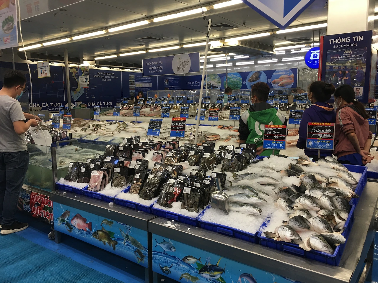 메가마켓 수산 코너가 제법 크게 자리를 잡고 있다. 살아 있는 광어부터 꽃게까지 그 자리에서 손질도 원하는 대로 해주기도 한다. (회를 떠주지는 않아요. 한국분들은 집에서 직접 떠서 드시는 경우가 있어요.) 연어의 경우는 이른 새벽에 그 자리에서 장만한 것을 사다오면 집에서 회로 쳐서도 먹을 수 있다. 살아 있는 새우는 그날 쪄먹거나 대하구이 해 먹으면 바로 그 맛입니다~ 캬~!