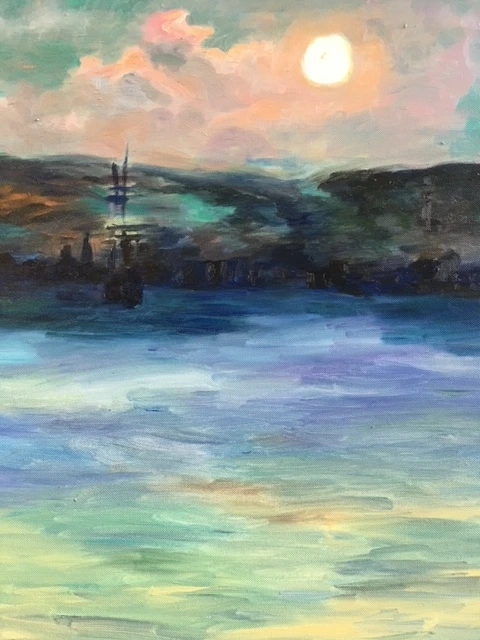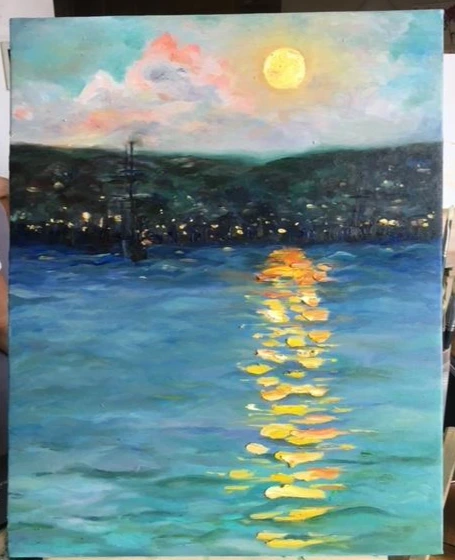 ‘유화의 깊은 맛을 느낄 수가 없어요. 덧칠을 하셔서 바다의 깊은 표현과 배와 육지의 어두운 부분을 더욱 깊고 깊게 나타 내셔야 합니다. 물결의 출렁임은 한 라인 한라인 씩 그리며 표현하셔야 해요.’