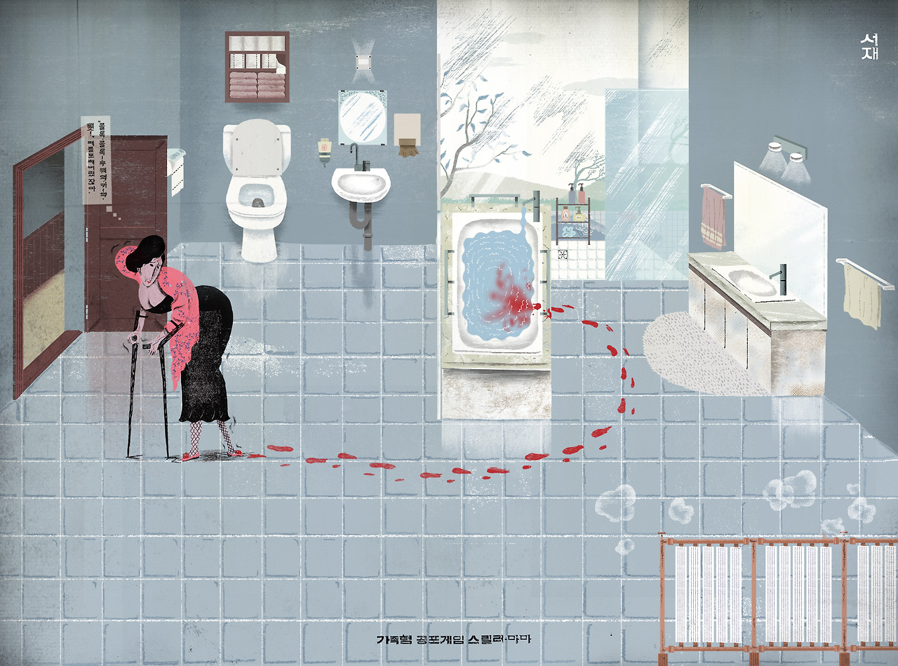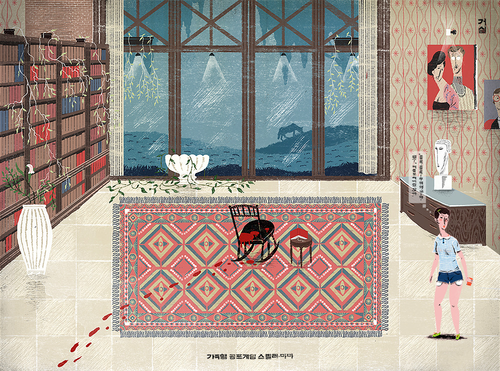 김도윤 작가님의 아트는 판화 스타일이다. 2D적인 느낌을 극대화해서 납작한 것은 둘째 치더라도, 원근이 과장되게 왜곡되어 있다. 예를 들어 거실의 전체 모양은 원근법이 적용되어 있는데, 바닥에 깔린 러그는 아닌 것처럼.