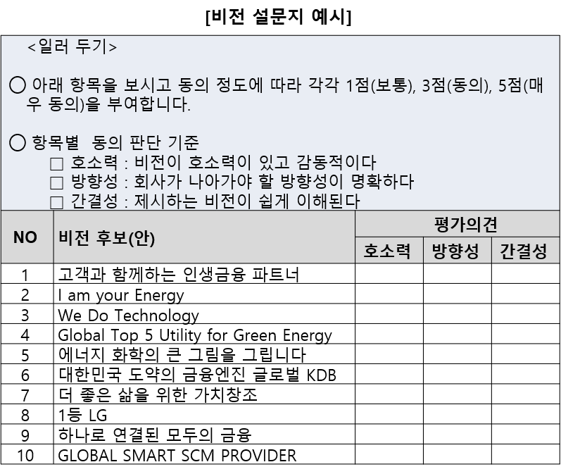 도출된 비전 후보군은 리커드 5점 척도법 보다 객관식 그리드형이 적합한 설문모형이다.