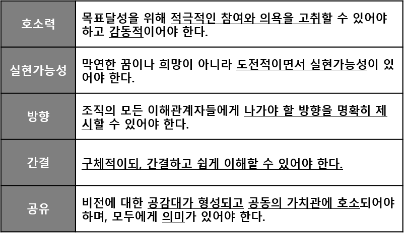 과거나 현재의 연장선상에서 미래를 고려하지 않고, 오직 조직이 가야만 하는 미래상이 반영되어야 한다