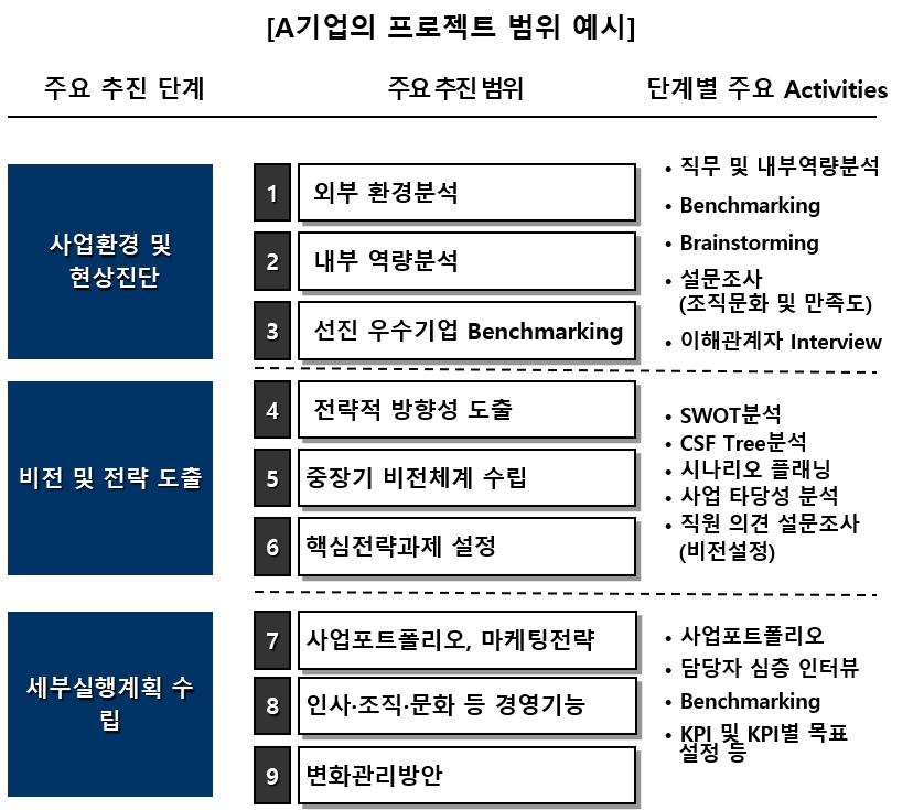 통상적 비전프로젝트의 범위는 경영진의 의사결정, TFT 구성원, 주어진 시간 등에 따라 다르지만 일반적으로 ①사업환경 및 현상진단 ②비전 및 전략 도출 ③세부 실행계획을 통상적 범위에 포함시킨다.