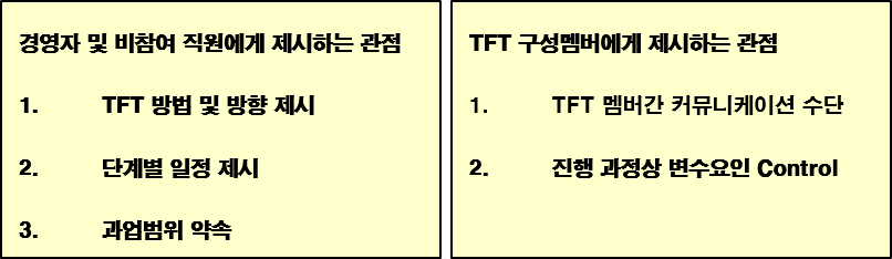경영진 및 일반직원에게 프로젝트의 개요, 목표, 활동범위, 사업수행일정 등의 내용을 공유하기 위해 작성되며, TFT 내에서는 커뮤니케이션 수단이자진행과정상의 변수요인을 관리하는 역할을 수행하게 된다