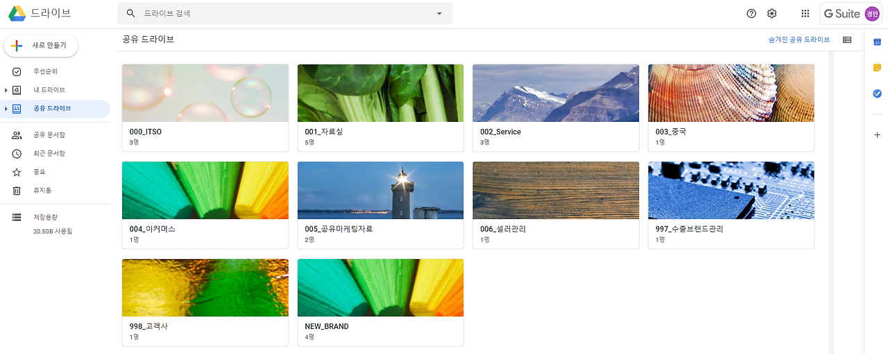 구글에서 돈 주고 비즈니스 G-suite에 계정 5인 이상으로 설정해두면 구글 공유 드라이브를 무제한으로 쓸 수 있다. 무제한으로 쓸 수 있다는 이유로 이전 회사의 계정을 안 지우고 매달 돈을 내가면서도 사용하고 있는데 파일링만 잘하면 매우 유용하다.