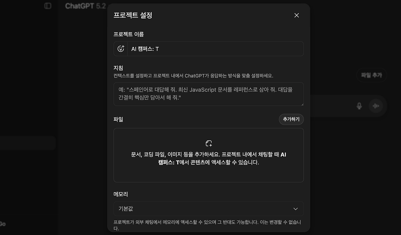다음으로, 각 프로젝트 안에서 오가는 모든 발화가 공통으로 공유해야 할 일관된 정보를 초기 맥락으로 주입했다. 이를 위해 ChatGPT의 [프로젝트] 설정에서 [파일]과 [지침]을 추가하는 방식을 활용할 수 있다.