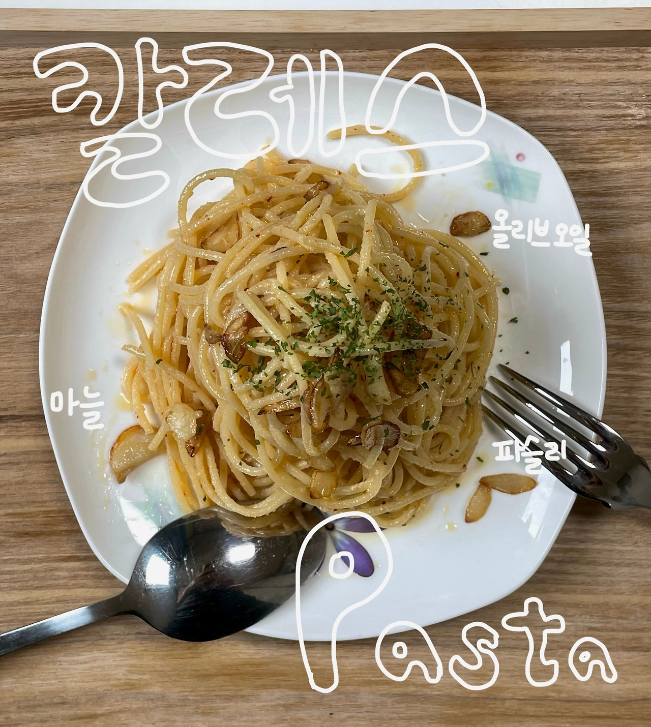 재료: 파스타 면, 소금, 마늘 8쪽(취향껏 가감), 올리브오일, 칼레스, 고춧가루, 파슬리