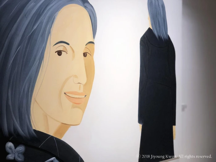 알렉스 카츠(Alex Katz)는 내겐 낯선 화가였다. 도슨트의 설명을 들으니 한국에 많이 알려지진 않았지만, 독창적인 초상회화를 구축하여 세계 10대 거장에 꼽히는 유명한 화가라고 한다. 1927년 뉴욕 브루클린에 태어난 그는 1946년 맨하탄 쿠퍼 유니온 미술대학에서 회화를 공부했다. 그는 뉴욕으로 대변되는 도시의 사람들, 그리고 그 삶의 모습을 우아하고도 아름답게 표현했다. 특히 그는 자신만의 독창적인 초상화 스타일을 만들어냈는데, 그 특징은 한 가지 색채로 칠해진 대형 화면 위에 가까이 클로즈업하여 크롭한 인물을 배치하는 것이다. 배경은 단색으로 단순화시켰고, 이는 그림에서 공간감을 제거했다. 단색의 배경은 인물에 더 집중할 수 있게 해주었고, 부분적인 인상의 강조를 통하여 보이는 것보다 더 깊은 본질에 대해 생각해보게 했다. 1960년대 이후에 빠르게 변화하던 뉴욕에서 그의 작품이 왜 그토록 많은 이들에게 인상적으로 각인되었는지는 그의 작품을 보면 바로 알 수 있다. 그의 작품은 디테일보다 분위기로 말한다. 그는 움직임을 포착한 그림을 즐겨 그렸고, 부분으로 전체를 유추하게 하는 그림을 그려 상상력을 이끌어내고, 관람자가 전체를 새롭게 구성하게 한다. 전체를 다 보여주지 않아도 부분을 온전히 느낌으로 전부가 되게 한다. 알렉스 카츠는 ‘클로즈업-크롭’ 기법을 통해, 초상화 속 인물이 고요함 속에서 보는 이의 시선을 사로잡고 그 인물이 가진 매력에 주목하게 한다.