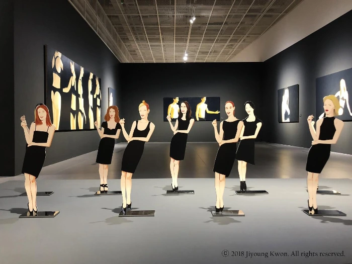 <로라>시리즈와 <댄서>시리즈는 그의 초상화에서의 특징적인 움직임의 포착과 표현의 최소화, 클로즈업 후 강조하는 기법이 여실히 드러나는 작품들이다. 어깨선과 감은 눈만으로도 모델을 둘러싼 전체의 분위기를 느끼게 하는 대형 그림들이 시선을 강탈했다. 카메라 필름의 프레임처럼 가로로 긴 띠 형식의 화면배열을 한 ‘프리즈(Frieze)’ 구성의 작품들은 댄서의 움직임을 영상처럼 재구성하게 해주었다. <CK> 시리즈와 <Coca-Cola Girl>시리즈는 전 세계 최초로 공개되는 것이라는 이야기를 듣고는, 도슨트의 설명 후에 다시 작품 앞 의자에 앉아서 물끄러미 작품 하나하나를 바라보기도 했다. 전시장 곳곳에 놓인 ‘컷-아웃’ 작품들은 특별히 보는 재미를 더했는데, 그것들은 인물 이외의 배경을 제거하고 작품이 놓인 그곳이 배경이 되게 하려는 의도로 평면의 알루미늄판 위에 그림을 그린 후 모양대로 잘라낸 평면적 조각이었다. ‘컷-아웃’ 작품들은 관람객인 나와 비슷한 크기로 그림을 함께 바라보는 것 같은 분위기를 연출하기도 하였고, <CK> 연작 사이에 검은 드레스를 입은 9명의 여성들을 표현한 ‘컷-아웃’ 작품은 전시장에 리듬감을 더해주었다. 이 외의 다른 작품에서 사용한 그의 오렌지색과 연두색의 배경은 특히 인상적이었다. 강렬한 색 가운데 그려진 클로즈업된 얼굴은 컬러에 주눅 들거나 위축되지 않고 당당했다. 배경색의 매력으로 멀리 있던 나를 끌어당긴 그림은 배경이 사라진 인물만 남겼다.