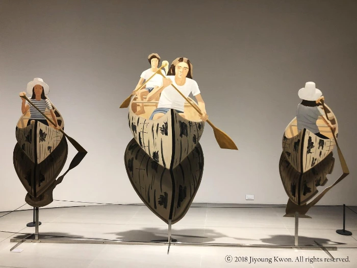 비가 내리는 날이었다. 쏟아지듯 내리는 비가 아니라 흩뿌리듯 내리는 비였지만, 금세라도 몰아서 내릴 것만 같은 회색빛 하늘을 보고 우산을 챙겼다. 비가 오는 날을 유난히 좋아하는 사람이 나와 가까이 있다. 맑고 건조한 날을 더 좋아하는 나와 그는 너무 달라, 여행을 가면 그날의 날씨로 인한 기분의 편차가 커질 때가 종종 있다. 나는 비 내리는 날에 걸을 때마다 다리 뒤쪽으로 빗물이 튀는 것이 싫고, 눅눅한 것도, 그리고 기분을 우울하게 가라앉히는 분위기도 별로다. 하지만 오늘 비오는 날의 창가에서 참 좋은 날이라며 흐뭇한 표정을 지을 한 사람을 떠올리며 이 비도 꽤 괜찮지 않느냐고 스스로에게 말해보았다. 세계에서 다섯 번째로 높다는 롯데월드타워는 멀리서도 볼 수 있어 내가 가야할 오늘의 목적지를 확실하게 알려주었다. 건물 윗부분은 온통 운무에 싸여 있었다. 가까이 갈수록 물에 적신 솜 한 움큼을 찢어서 벌려놓은 것 같은 구름은 점점 짙은 색으로 무겁게 내려앉고 있었다. 롯데월드타워의 아랫부분을 감싸 안은 롯데월드몰의 입구 위쪽에는, 눈을 감고 고개를 젖혀 목을 길게 뺀 우아한 여인의 프로필 이미지가 ‘ALEX KATZ’라는 간결한 글자와 함께 보였다. 롯데월드타워를 올라가는 길은 롯데월드몰과는 달리 조용했다. 엘리베이터의 7층 버튼을 누르고, 잠시 후 롯데뮤지엄에 내렸다.