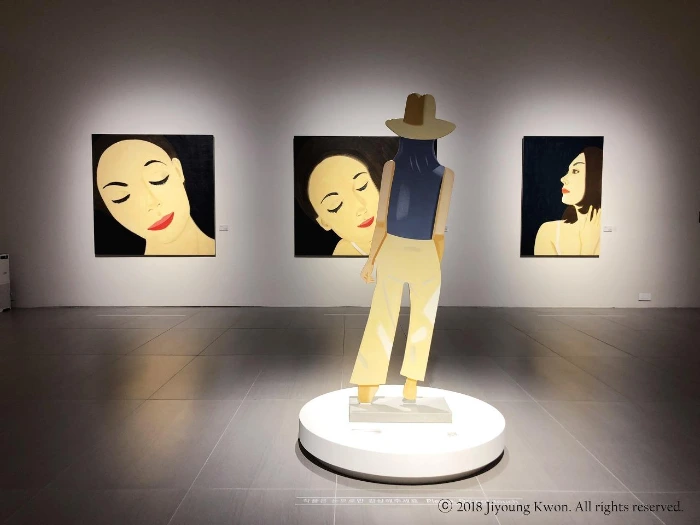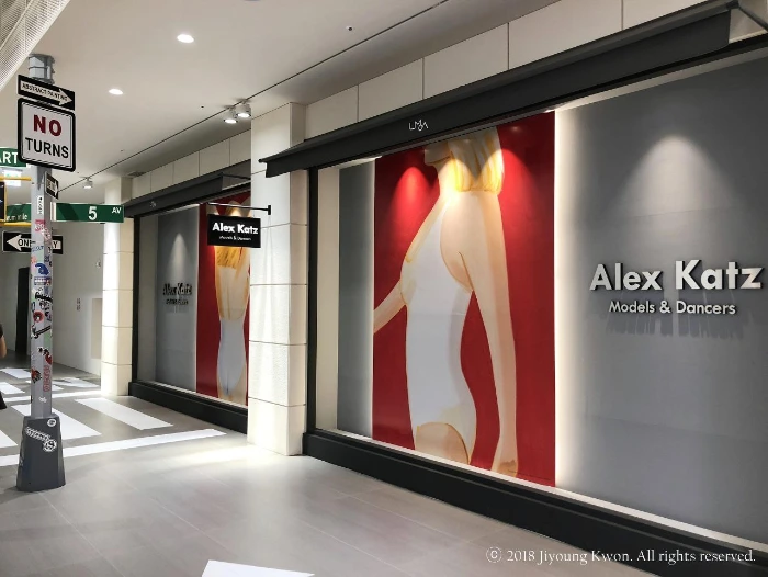 2018년 1월에 롯데뮤지엄은 ‘전세계 현대미술의 역동적이고도 새로운 움직임들을 소개하겠다’는 열망으로 거대한 마천루 롯데월드타워의 7층에 개관했다. 현재 진행 중인 전시는 <알렉스 카츠 전, 아름다운 그대에게>로, 개관전이었던 <댄 플래빈, 위대한 빛>에 이은 두 번째 전시다. 많은 미술관들이 단독건물을 사용하고 있는데 반해, 롯데뮤지엄은 7층에 위치하고 있어 공간 활용에 있어 더 고민을 많이 했을 것 같다. 그 고민의 결과는 내게 신선함으로 다가왔다. 엘리베이터 문이 열리고 몇 걸음 들어섰을 때, 실내이지만 골목에 와있는 것 같은 기분을 느끼게 해준 인테리어가 인상적이었다. 바닥은 그레이컬러로, 그 위에는 횡단보도와 방향표시기호가 화이트컬러로 그려져 있었고, 복도 중앙에는 길거리에서 볼 수 있는 ‘STOP’사인과 ‘ONE WAY’사인 등이 부착된 기둥이 세워져있었다. 길거리에서 바라보는 쇼윈도우처럼 느껴지는 한쪽 벽면에는 짧은 어닝 아래로 알렉스카츠의 그림 프린트가 대형으로 부착되어 있었다. 쉽게 전시실로 들어가지 못하고 서성이게 하는 로비였다.