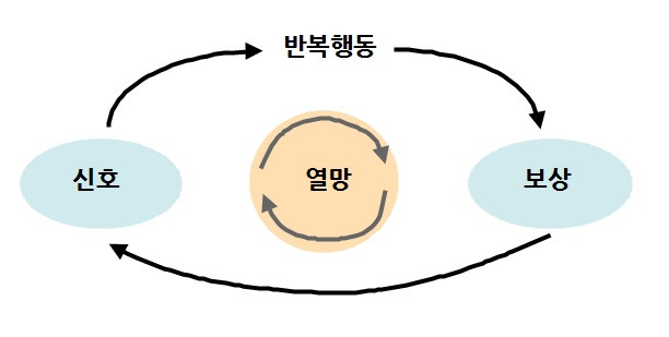 내가 직접 그려본(좀 어설프지만^^) 이 책의 핵심이 되는 습관 고리이다. 이 책에서는 이 습관 고리를 사용하여 습관과 관련된 연구 내용과 실험, 그리고 실제 상황 등을 알기 쉽게 표현하고 있다. 습관이 형성되기 위해서는 기저에 보상에 대한 강한 열망이 작동해야 하고 어떤 신호가 있을 때마다 어떤 행동을 하고