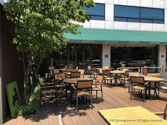 햇살이 쏟아지는 속도가 빨라지고 있는지 피부가 따갑게 느껴졌다. 뜨거운 기운이 머리 위와 얼굴을 덮으니, 이제 여름이구나 싶은 낮이었다. 시장기가 느껴지고 조용히 책도 읽고 싶은 점심시간에 찾은 곳은 지하철 7호선 논현역 근처의 북카페 ‘토끼의 지혜’였다. 카페의 실내만큼이나 커다란 테라스에 놓인 테이블과 체어가 햇빛을 가득 머금었다. 초록색의 기다란 어닝과 테라스 주위에 심긴 나무들이 푸르다.