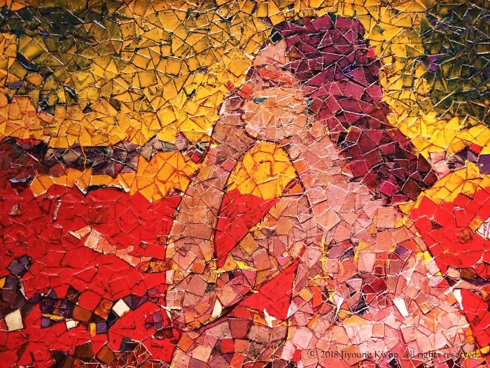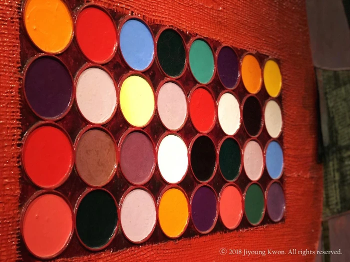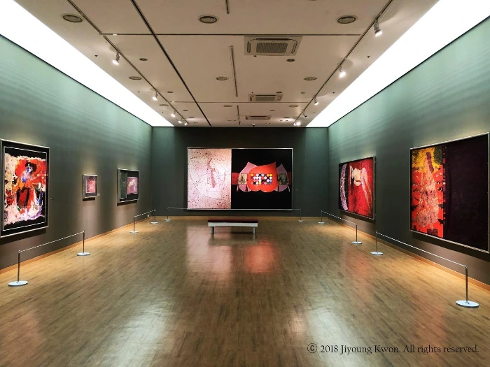 김흥수 화백은 사실 사람들의 관심을 끌었던 결혼보다 미술사 속의 주요인물로 기억되어야 할 화가이다. 그는 1919년 함경남도 함흥에서 태어났다. 1940년 도쿄 예술대에 입학했으며, 1955년, 36세의 나이였던 그는 해방 후 한국인 화가로는 최초로 파리유학을 떠났다. 그림 속에서 음과 양, 혹은 구상과 추상이 공존하는 현대미술의 새 양식인 하모니즘(harmonism)은 1977년 미국에서 김흥수 화백에 의해 발표된 미술사조이다. 추상미술의 등장 후에 구상과 추상이 서로 반복적으로 상극이 되어버린 상황 속에서 그 상반되는 것들이 그림 속에서 결국 조화되는 것을 표현하는 미술사조를 선언한 것이다. 한국 화단의 자랑이기도 했고, 사랑과 열정의 화가라는 의미에서 ‘한국의 피카소’라고도 불리던 김흥수 화백의 작품들이 전시되어 있는 공간은 나에게 그의 작품을 처음 만나는 곳이 되었다. 진하고 강렬한 색감, 그림 속에 그려진 팔레트 속의 다양한 컬러들, 오목하고 볼록한 작품의 질감이 뜨겁고 열정적인 기운을 뿜어내고 있었다. <사색하는 여인> 작품은 팔을 턱에 괸 채 생각에 잠긴 여인의 모습을 그린 것인데 모자이크로 표현되어 신비로운 느낌을 주었고, 차갑고 뜨거운 색들이 자연스럽게 어우러지며 퍼지는 배경이 고혹적으로 느껴졌다. <사랑을 온 세상에>라는 작품은 20년간 작업한 대형 작품으로, 선이 고운 여성이 승무를 하고 있는 모습을 분홍빛 배경에 담았다. 이 역시 모자이크로 된 작품이고, 승무하는 여성의 부드러운 컬러와 대비되어 작품의 오른편에는 검은색 바탕에 다채로운 색깔의 팔레트 속 물감들을 그려놓았는데, 부딪혀 보일 수도 있는 것들이 잘 어우러지는 것을 볼 수 있었다.