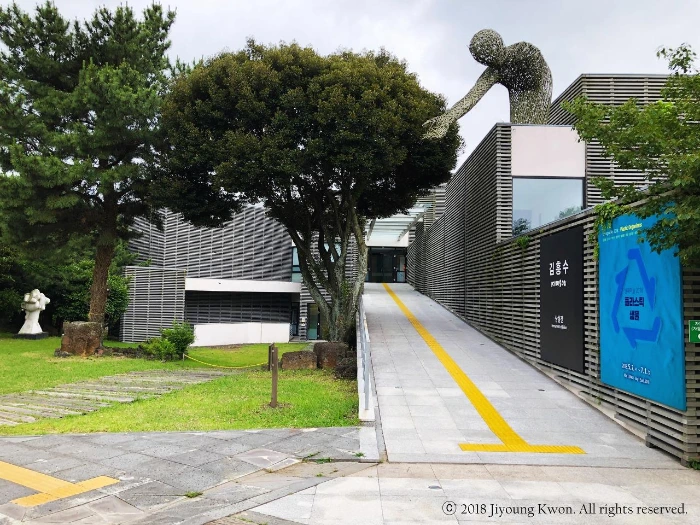 여행을 가게 되면, 그 여행지에 있는 미술관을 먼저 검색하고 마음이 동하는 곳을 찾아가 꼭 관람을 하곤 했다. 미술관이나 건축물에 대한 관심으로 여행지를 선택할 때도 많았을 정도로 나의 여행에 있어 미술관 방문은 중요한 일정에 속하는 것이었다. 이번엔 제주도다. 여행책자에서 제주에 있는 미술관을 찾아보다가 몇 군데 포스트잇으로 표시를 해두었다. 그 중의 하나가 바로 <제주 현대미술관>이었다. 주차를 하고 직선으로 뻗은 짧지 않은 산책길을 걸어가니 진회색의 모던한 건물이 보였다. 6년 전 쯤 왔을 때에 인상적으로 보았던 최평곤 작가의 거대한 조형물이 건물 위에서 여전히 손을 내밀며 환영하고 있었다.