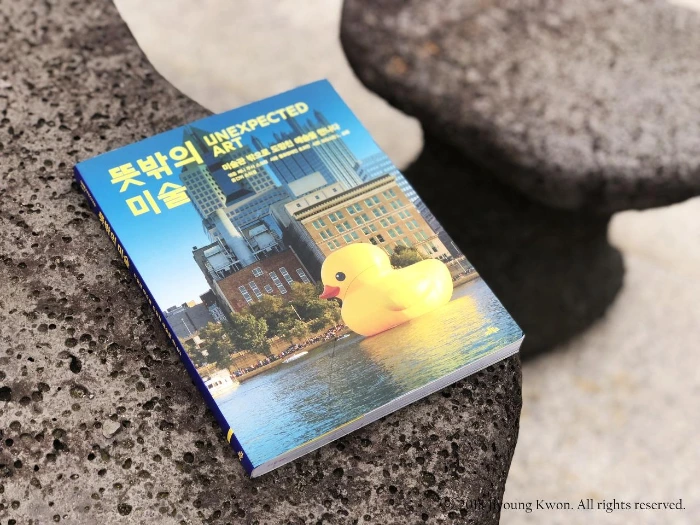 제주에서 읽고 싶은 몇 권의 책을 챙겨갔는데 제주현대미술관에 갈 때는 <뜻밖의 미술>이라는 책을 들고 갔었다. 미술관의 정원의 기댈 곳을 찾아 앉아 한가로이, 상상하지도 못했던 번뜩이는 아이디어로 창조된 예술을 만나고 싶었다. 이 책의 부제는 ‘미술관 밖으로 도망친 예술을 만나다’이다. 미술관이 아닌 다른 공간-예를 들어, 도심 속 야외 공간, 숲 속, 호수 위 등의 공간-에 설치되어 빛나던 작품들을 사진에 담아 모아놓은 재미있는 책이다. 굳이 작가설명이나 작품설명을 보지 않아도 이미지만 보아도 눈이 동그랗게 되고, 가슴 속으로 신선한 기운이 퐁퐁 터지고 샘솟듯 올라오게 해주는 비타민 같은 책이었다.
