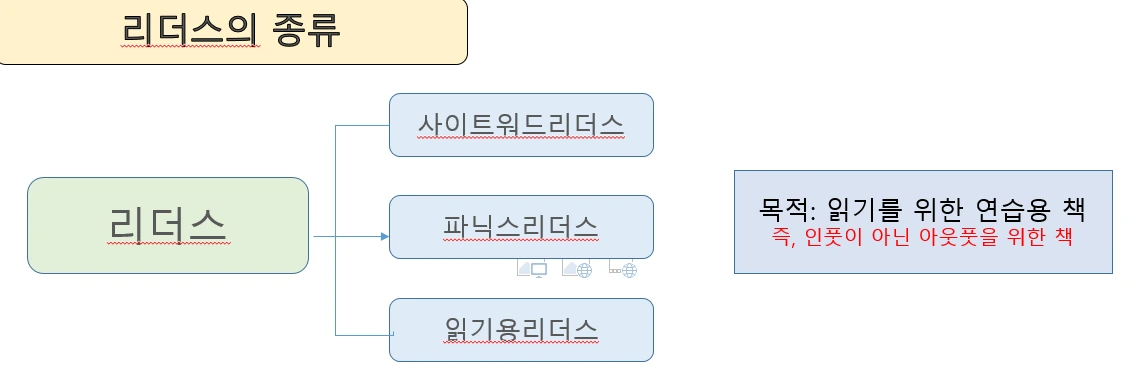 리더스는 목적에 따라 사이트 워드 리더스와 파닉스 리더스, 읽기용 리더스로 나뉜다. 리더스는 목적 자체가 읽기를 연습하는 책이므로, INPUT의 목적보다는 OUTPUT의 목적이 크다. 고로 충분히 인풋을 채우고 읽기 연습이 필요할 때 목적에 맞는 리더스로 읽기 연습을 하면 된다.