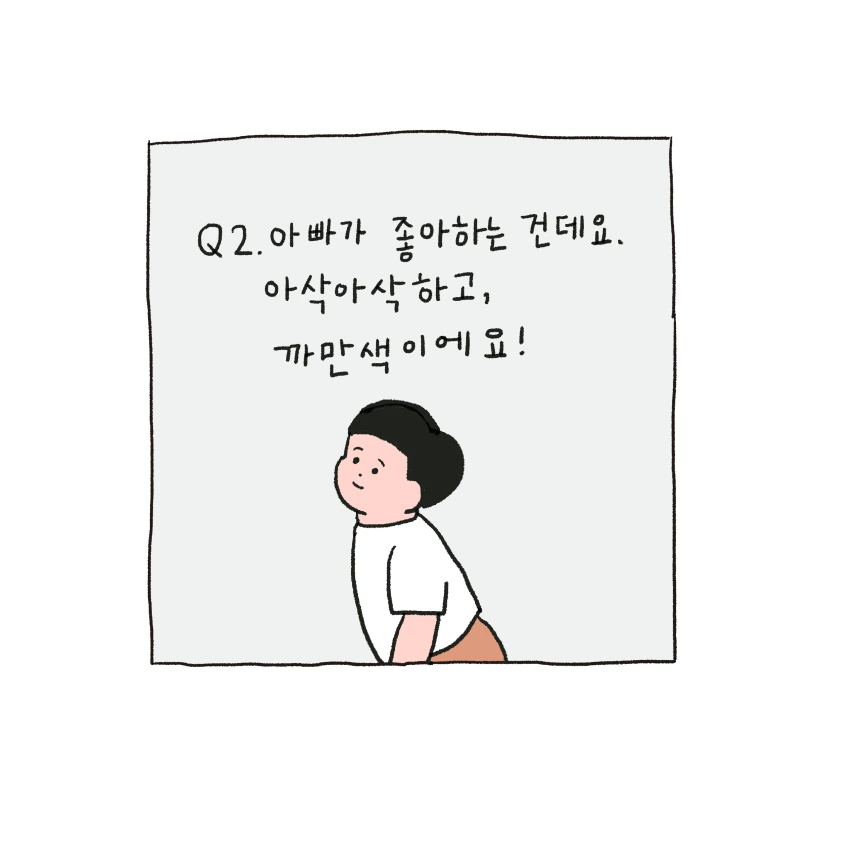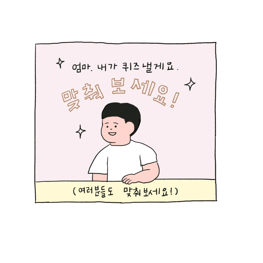 요새 땡이와 퀴즈놀이를 자주 합니다. 단어 카드를 보고 한 명이 설명하면 한 명이 맞추는데 땡이의 설명이 귀여워서 그대로 담아 그려봤어요! 여러분도 맞춰보세요