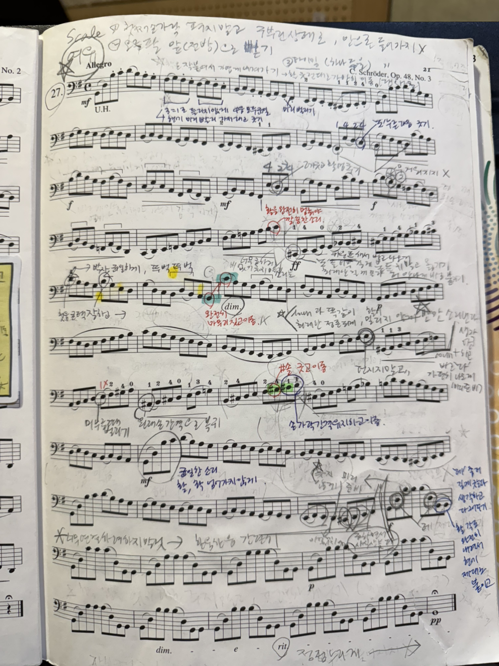 지금 나도 세련되게 깔끔한 악보에 한두 가지 포인트만 표시하고 싶지만, 그러면 일주일에 한 시간 하는 수업 시간이 끝난 후, 머리는 하얗게 리셋이 되고, 일주일 내내 헛연습만 해갈 수 있으므로, 미련해 보이고 촌스러운 것 같지만 정말 열심히 그것도 아주 구체적으로 받아 적는다.