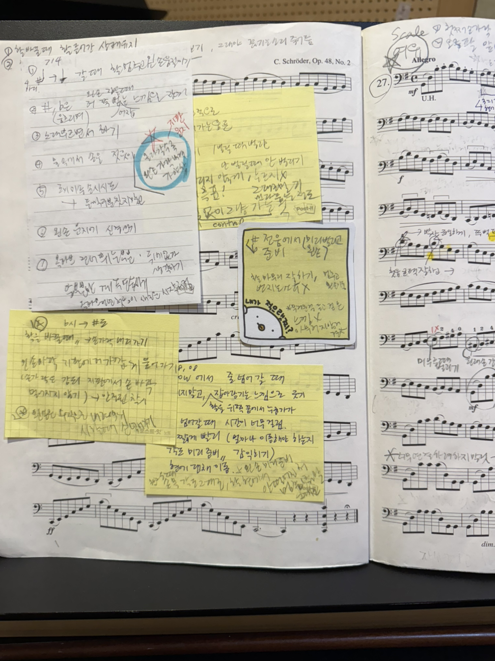 이 문제를 극복하기 위해서 내가 선택한 방법은 필기다. 물론 말이 글보다 훨씬 빠르기 때문에 선생님께서 중간 중간에 하시는 말씀을 그대로 다 받아 적기는 매우 어렵다. 그래서 수업을 통째로 (스마트한 기계의 힘을 빌려) 리코딩을 하고 싶다는 말을 농담처럼 했는데 그건 선생님께도 예의가 아닌 것 같아 진짜로 그렇게 하지는 못 하고 있다. 처음에는 악보 사이사이에 미친 듯이 연필로 받아 적었는데, 급하게 적다 보니 글씨도 날아다니고 악보 사이에 막 적은 거라 무슨 말인지 잘 해독도 안 되고, 일단 딱 읽기가 싫게 생겼다. 그러면 결국은 또 내 마음대로 아무렇게나 막 연습을 해가서 지적받았던 부분이 잘 개선되지 않는다. 그래서 그 뒤엔 작은 수첩을 마련하기도 했는데, 이 방법의 문제는 연습할 때 수첩을 따로 펴서 대조해 가며 잘 보게 되지 않는다는 것. 결국 지금 쓰고 있는 방법은 공간이 비교적 넉넉한 포스트잇을 준비해 가서 열심히 받아 적은 후 관련된 부분 옆에 붙이는 식이다. 그런데 선생님께서 하시는 말씀을 되도록 다 받아 적으려다 보니 거의 책에 포스트잇을 도배하다시피 하게 된다.