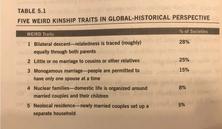 세계에서 소수에 속하는, 그렇지만 부유한 서유럽을 만든 한 축은 기독교(로마 카톨릭)의 공헌이 있었기 때문이다. 이 기독교가 오늘날의 The WEIRD(서구의 부유하고 교육받은 민주주의 및 산업화 시대를 누리는 계층을 약자로 WEIRD라고 한다)를 형성할 수 있게 역사적으로 저질렀던 짓이 근친상간 금지, 일부다처제 금지였다. 이걸 왜 '짓'이라고 부르냐면 중세 당시, 사람들로부터 엄청난 반발을 샀기 때문이다. 근친상간은 부족이나 가문을 지키는 중요한 역할을 했다. 자기 구성원 내에서만 결혼을 해야 조상들이 대대로 물려준 영토와 재산을 지킬 수 있었다. 일부다처제는 부인이 아들을 낳지 못할 경우 다른 부인을 통해서라도 아들을 낳고 대를 잇기 위한 강력한 수단이었다. 남편이 아들도 없이 죽었을 경우 부인은 다른 형제와 결혼을 해서라도(수혼제도) 아들을 낳을 수 있어야 했고, 이는 미망인과 그 재산의 이탈을 막을 수 있었다. 이걸 읽기 전까진 근친상간과 일부다처제가 단순 남자들의 지난 친 욕망 때문이라고 생각했지만, (그런 이유도 없진 않겠지만) 이들은 좀 더 경제적이고 사회적인 압력이 있었기 때문에 유지된 제도였다.