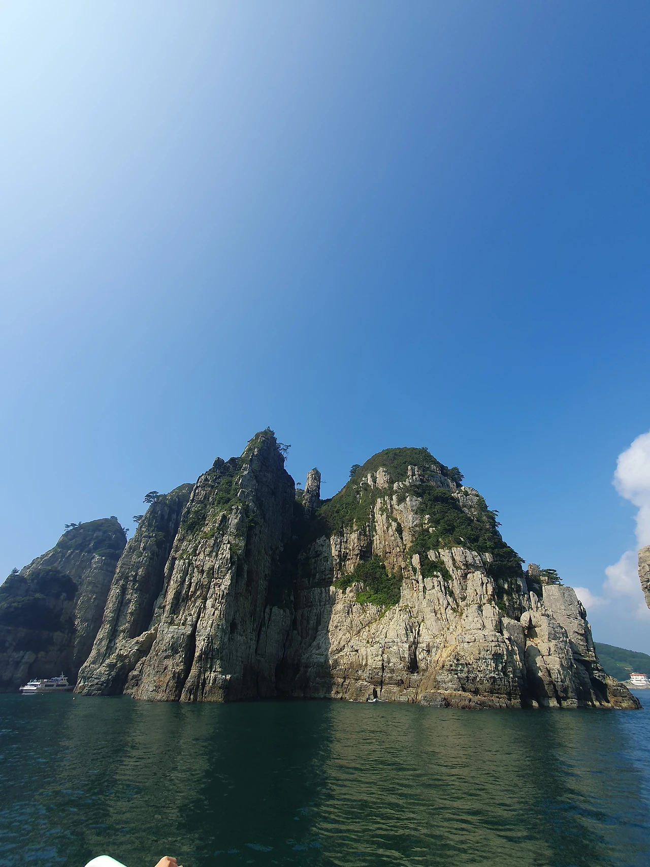 8월 여름날 거제/통영은 내 피부에 태양의 타투를 남겨놨다. 바닷가 쪽이라 시원할 줄 알았는데 오산이었다. 새벽 비행기를 타고 부산에 도착한 후 렌터카를 통해 거제도로 넘어갔다. 첫날은 한려해상공원을 둘러보는 게 목표였다. 초등학교 수업 때 아름다운 곳이라 듣고 줄곧 염두하고 있었는데 드디어 확인하는 기회를 가진 것이다. 1시간 반 동안 운전해 겨우 9시 배를 잡았다. 배를 타고 15분쯤 지났을 때 기암으로 이루어진 섬들이 우후죽순으로 나타났다. 듣던 대로 아름다웠지만 감흥을 줄 정도는 아니었다. 여행하면서 아름다운 곳을 이미 많이 봐서 그런 걸까? 굳이 비교하자면 베트남에 있는 하롱베이의 축소판 같은 느낌이었다. 그래도 계속되는 선장님의 친절한 설명 덕분에 심심하지 않게 둘러볼 수 있었다. 해금강은 꽤 볼만했다. 선장님이 말씀하시길 오늘은 파도가 잔잔해 절벽 사이까지 가까이 다가갈 수 있다고 했다. 두 절벽과 그 사이를 가로지르는 바닷물의 철썩거림이 웅장함을 주었다.