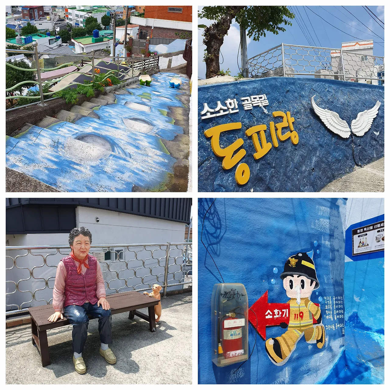 둘째 날은 통영의 동피랑, 서피랑을 구경했다. 피랑은 벼랑이라는 뜻이다. 두 피랑 사이 거리가 얼마 안 되어 20~30분 정도 서피랑을 둘러보고 1.5km 정도 걸어서 동피랑에서 1시간 정도 보내면 충분히 다 돌아볼 수 있다.