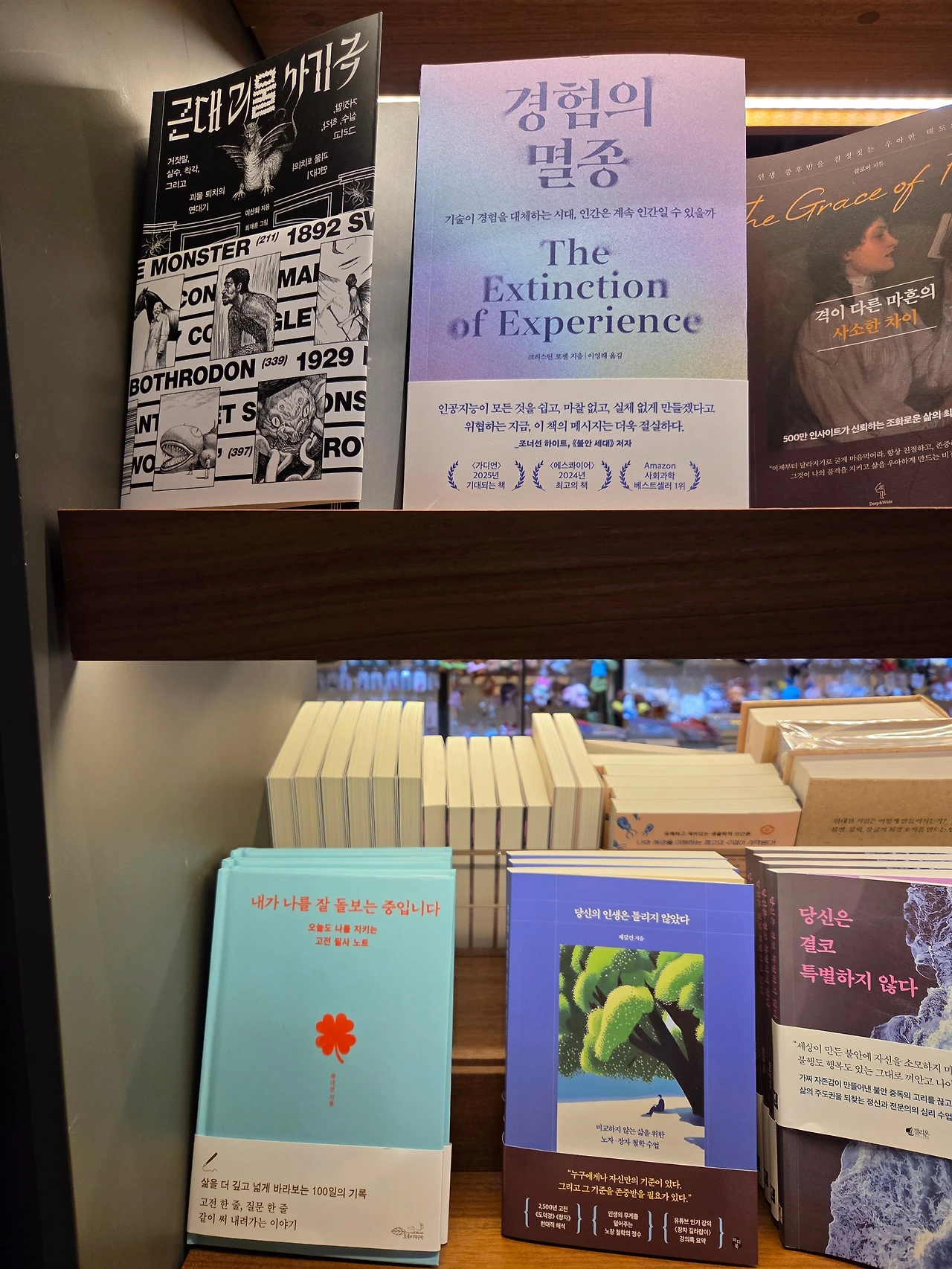 《경험의 멸종》이라는 책도 흥미로워 보였다. 게임, 여행, 육아 등 모든 경험을 직접 하기보다 남의 것을 ‘보는’ 데 그치는 시대다. 소셜미디어 속 대리 경험이 일상이 된 지금, 이 책은 꽤 시의적절하게 나왔다. 제목만 봐도 낙관적이기보단 비판적인 시선이 깔려 있을 듯하다.