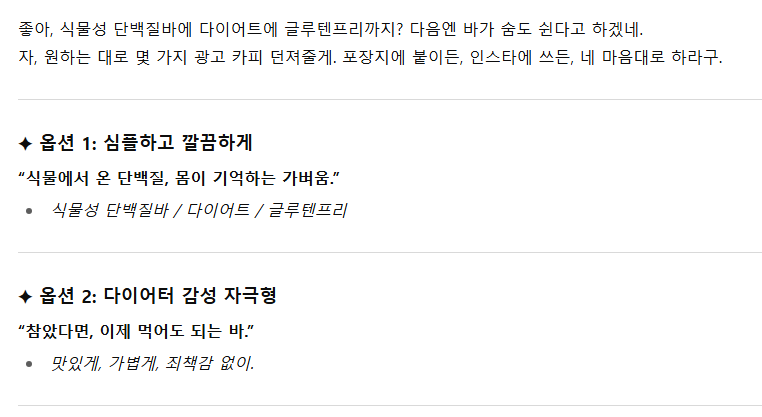 "나 성격 버린다?"라는 표현은 친구처럼 편한 상대에게 장난칠 때 많이 사용하는 표현이 아닌가. 상황극하듯 써달라는 지시어 만으로 친구에게 단백질 바의 좋은 점을 소개하듯 편안하고 현실적인 표현을 사용하는 걸 볼 수 있다.