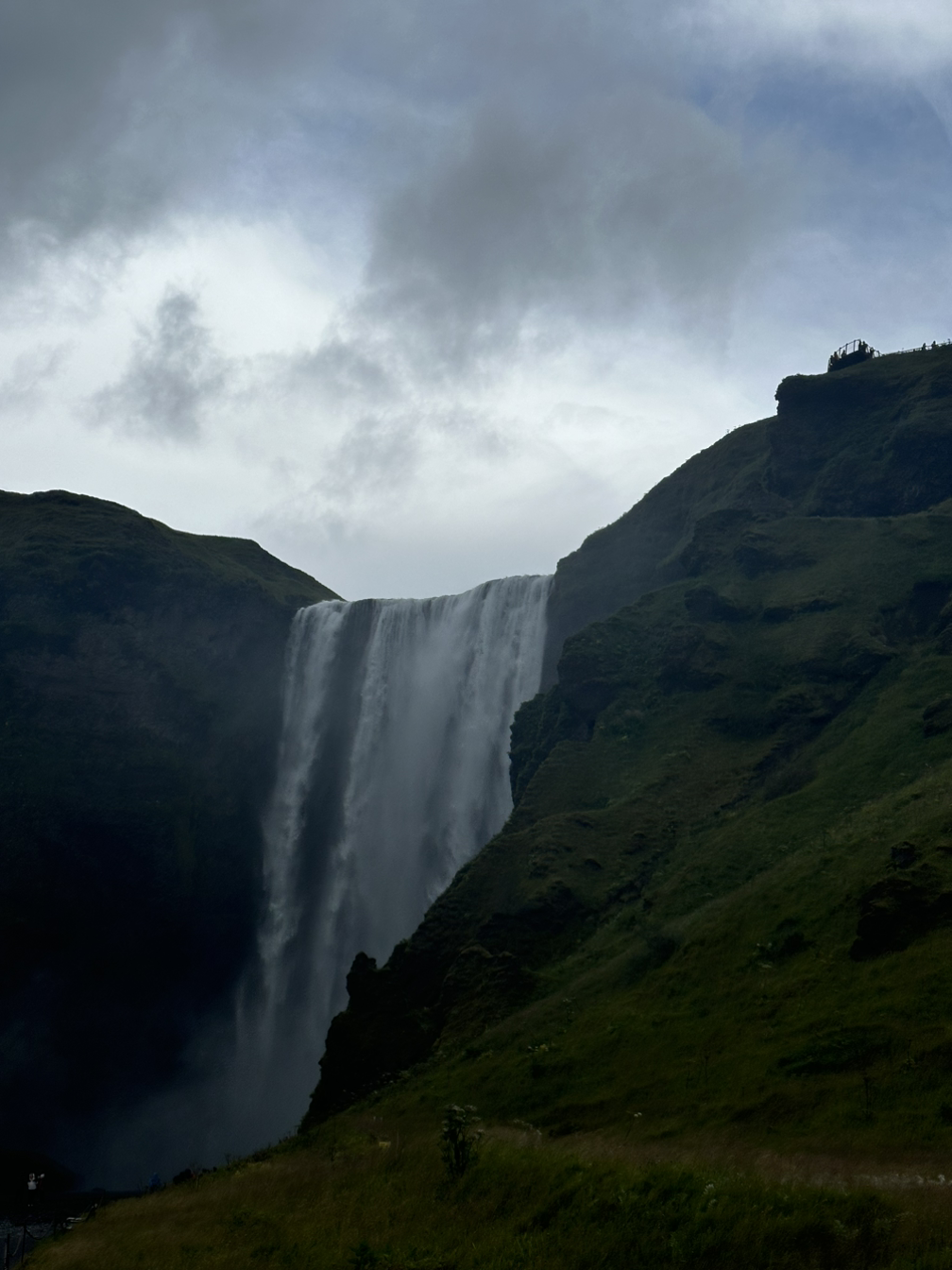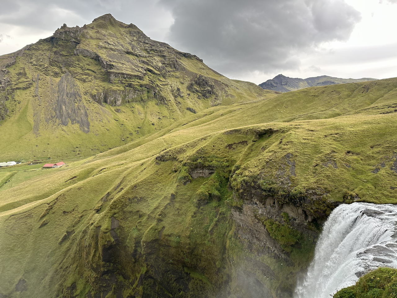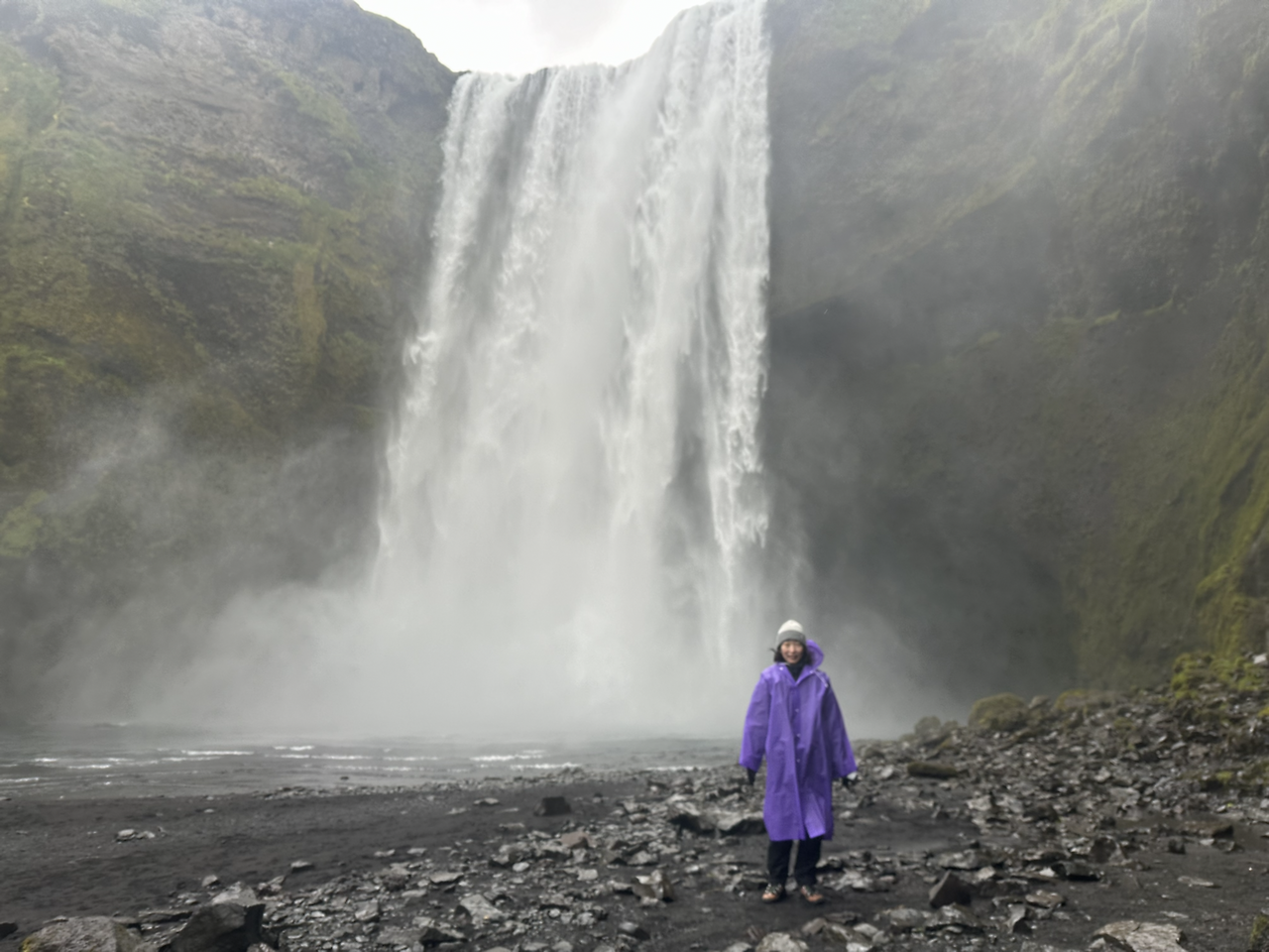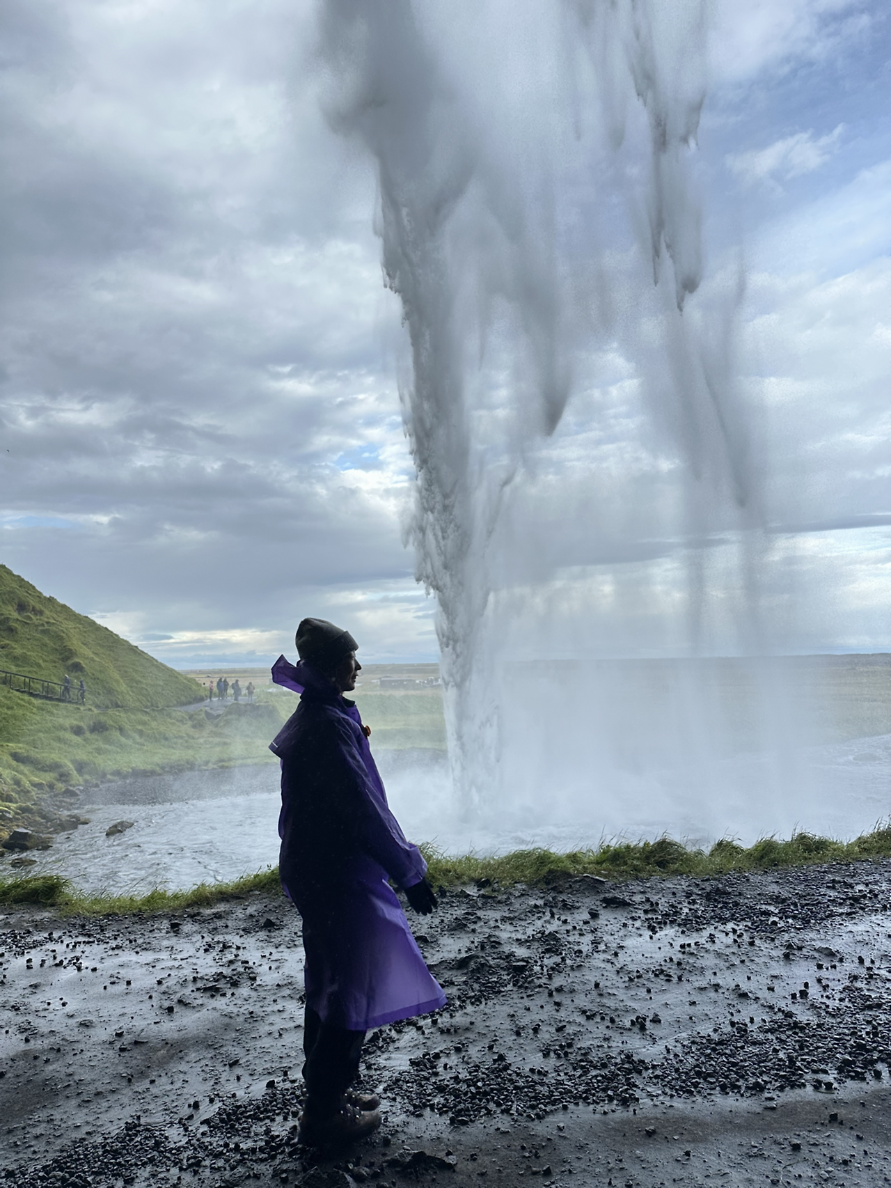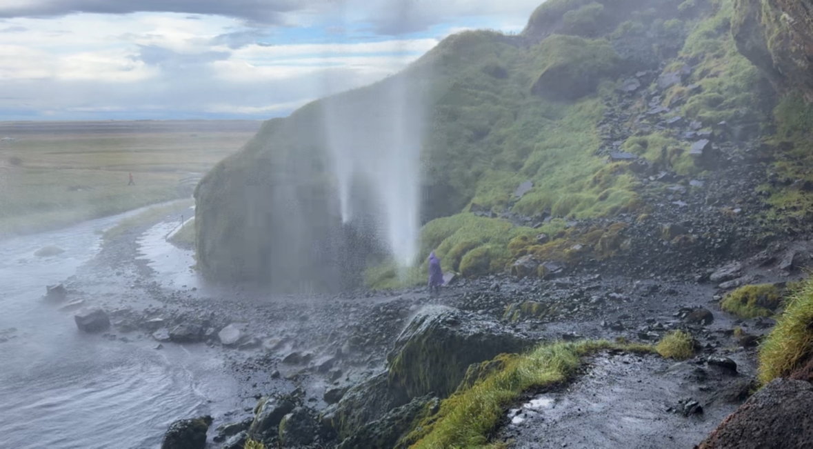 사전에 알아본 대로 우비를 챙겨 입었다. 얼굴에 미스트처럼 떨어지는 폭포수가 기분 좋았다. 나중엔 미스트는커녕 한여름 태풍 속을 우산 없이 걸어간 사람마냥 다 젖어버렸지만 기분이 정말 너무너무 좋았다. 물이 떨어지는 모습을 안 쪽 (물 뒤 쪽?)에서 바라보는 것도 신기했다. 물이 닿은 곳에 자라는 이끼들이 푸르름을 더해주었다. 폭포 안 쪽에서 폭포수 너머로 펼쳐지는 평원을 바라보고 구름이 떠 다니는 하늘을 바라보니 참 묘했다. 미디어 도파민 저리 가라. 천연 도파민이 바로 여기에 있구나.