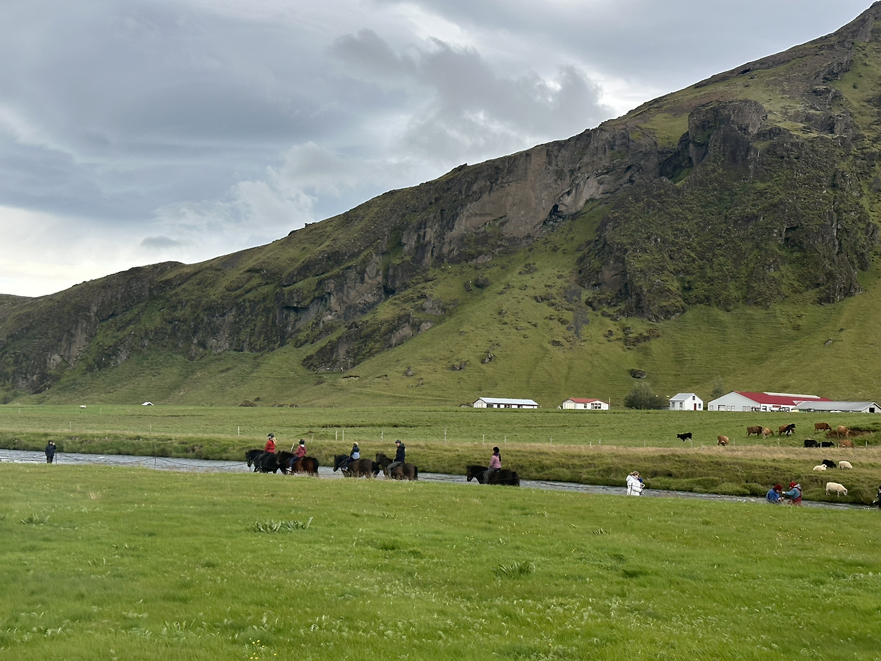 스코가포스는 멀리서 봐도 장엄했다. 크기로만 보면 전날 본 굴포스가 더 크지만, 굴포스는 스코가포스처럼 폭포수 앞에 걸어갈 수 있는 곳이 아니다. 굴포스는 '바라보는' 폭포라면, 셀야란즈포스나 스코가포스는 '경험하는' 폭포였다. 폭포 주변의 아름다움도 한몫했다. 노란 민들레가 피어있는 들판, 깎아져 내린 돌이 그대로 드러난 산, 검은빛을 띠는 자갈, 유유히 승마를 즐기는 한 무리의 사람들까지. 이 가운데 폭포가 떨어지는 것이다.