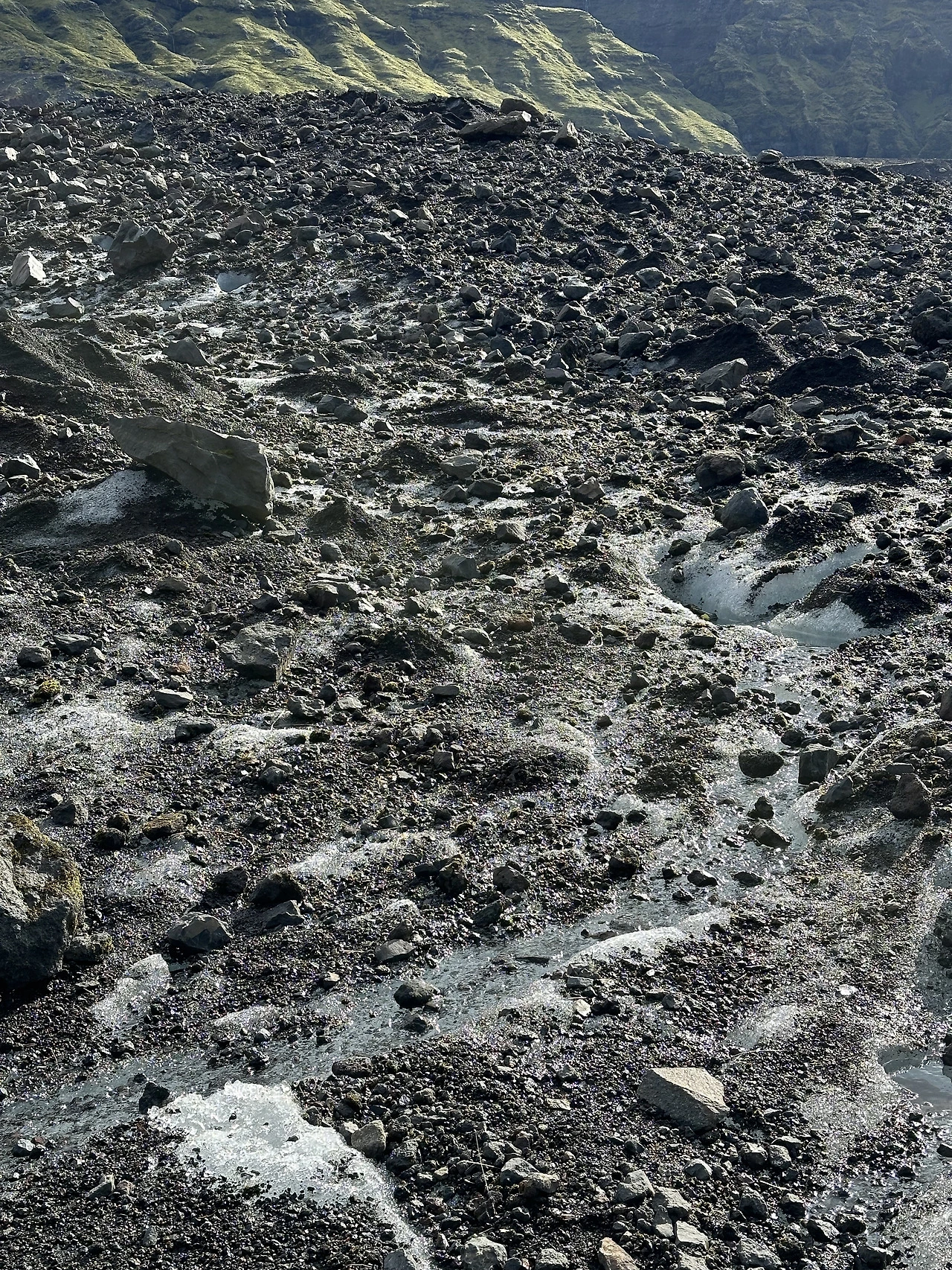 릴리의 설명에 따르면 거대한 빙산이 점점 앞으로 움직이면서 돌을 깎고, 깎인 돌이 자갈이 되면서 이렇게 돌과 자갈과 얼음이 섞이게 되는데, 그러다가 빙산의 크기가 작아지면서 밀려온 빙산의 앞부분, 지금 우리가 걷는 길은 이제 거의 돌과 자갈만 남게 되고 얼음은 녹아 호수가 된다고 한다. 그리고 화산재가 날아와서 검은색을 띠는 것이라고. 빙하와 빙산이 얼음이니 투명하거나 하얀색이라고 생각하지만, 사실 거뭇한 색을 띠어 오묘한 느낌이다. 인터스텔라가 떠올랐다.