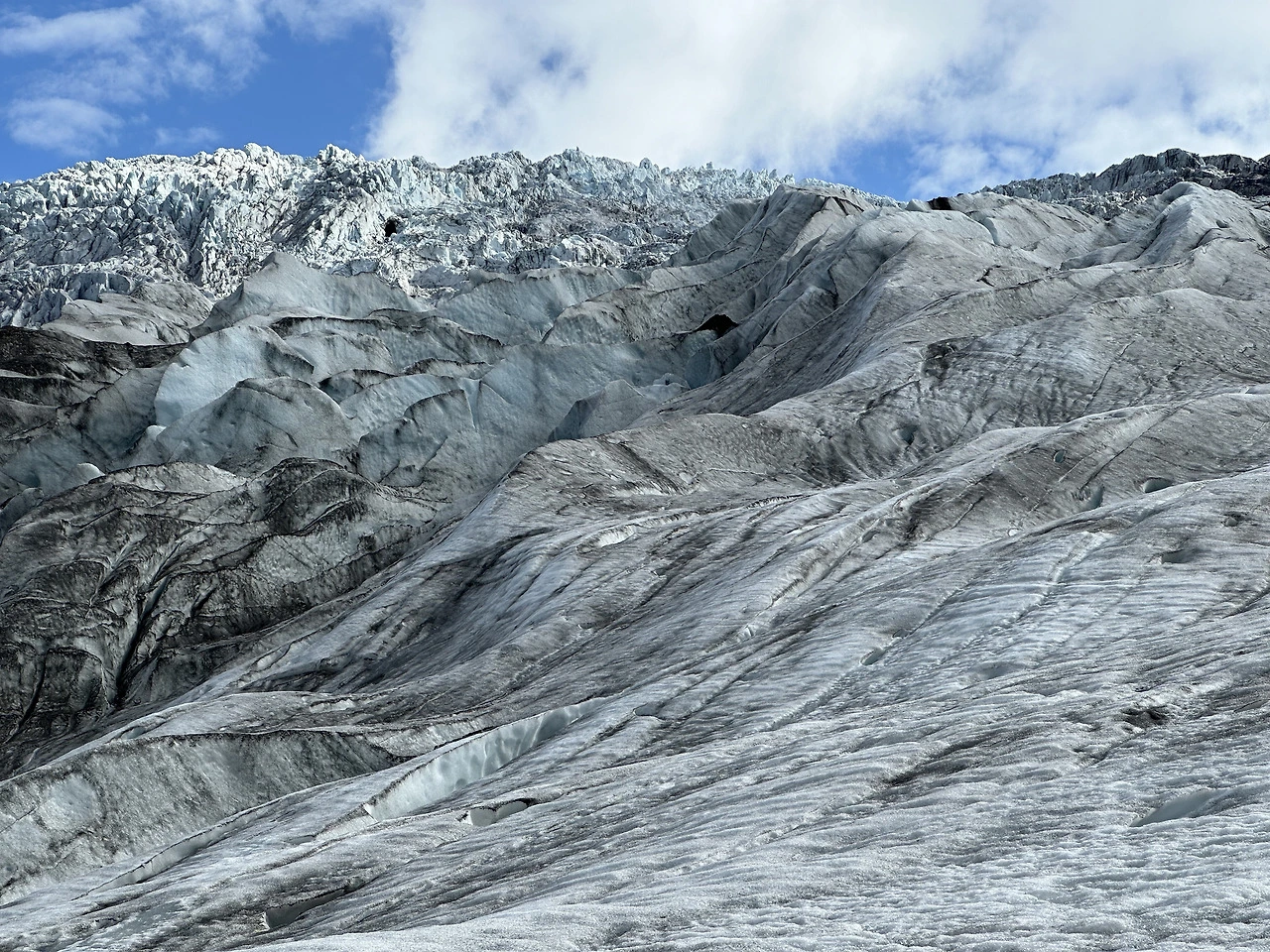 시간과 가격을 비교해 보고 결국엔 빙하를 걸어 올라가는 3시간짜리 투어를 선택했다. 3일 차에 드디어 맑은 하늘이다. 3시간 내내 빙하를 걸어 다니는 줄 알았는데, 버스로 이동하고 또 자갈길을 한 시간 정도 걸어야 했다. 빙하는 그냥 얼음 덩어리인 줄 알았는데, 왜 이렇게 검은 돌밖에 없나 싶었다.