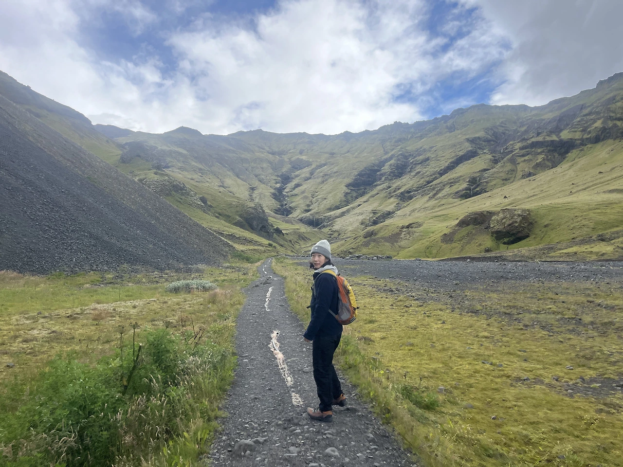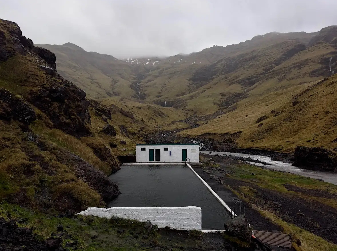 Seljavallalaug를 구글맵에 표시하고 알려주는 길을 따라 들어갔다. 비포장도로를 좀 들어가다 보면 '개인 사유지입니다. 3시간 이상은 머물지 말아 주세요'라는 표지판이 있다. 3시간이나 놀 수 있다니 정말 generous 하신 분... 표지판을 지나면 곧 주차장이다. 수건이랑 간단한 짐을 챙겨 나오는데, 생각보다 주차장과 수영장 거리가 좀 많이 멀었다. '수영장 없어졌나' 싶은 생각이 들 만큼 걸었다. 아무리 걸어도 수영장이 나오지 않아 그만 돌아갈까, 싶은 마음이 들었지만 인내하고 계속 갔다. 체감상 30-40분? 걸어야 나오는 비밀의 수영장. 하지만 말로 다 할 수 없을 만큼 아름답기 때문에 하이킹한다 생각하고 걸으면 맘이 편하다.