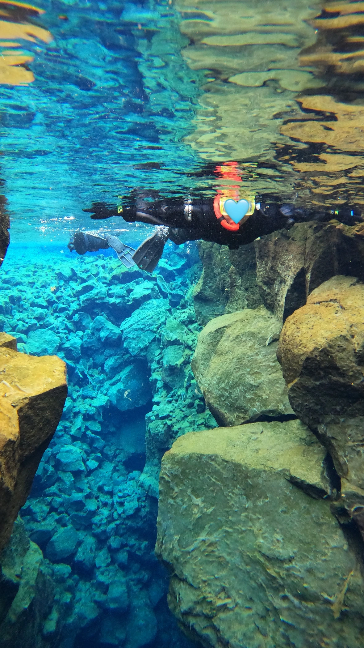 시야가 100m까지 나오는 맑은 물속은 생전 본 적이 없는 기이한 이끼 생태계를 드러냈다. 비눗방울 같은 기포가 이끼처럼 돌을 따라 겹겹이 생겨있었고, 미역같이 흐물거리며 자라나서 또 다른 색과 형태를 이뤘다. 한 바퀴 돌자 또 다른 모습이 나타났다. 이번엔 바닥이 돌이 아니라 모래였다. 물 색은 청량한 색 그대로인데 물감으로만 보던 색을 바다에서 보니 신기했다. 세상에서 가장 깨끗한 다이빙포인트라는 실프라, 입수 전에 이곳 물도 한 입 마셔봤다. 드라이슈트를 입어 체온은 유지되었는데 얼굴과 손은 그대로 물 온도에 노출되었다. 20분 정도 스노클링을 하자 수온 2-3도의 물이 차갑게 느껴지기 시작했다.