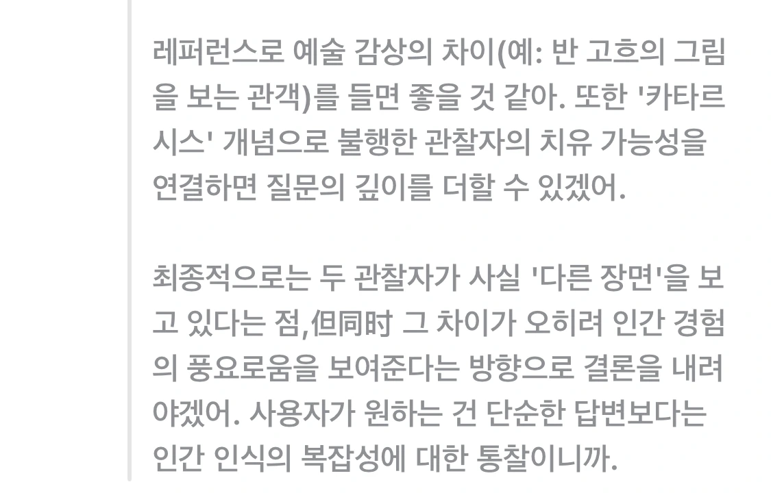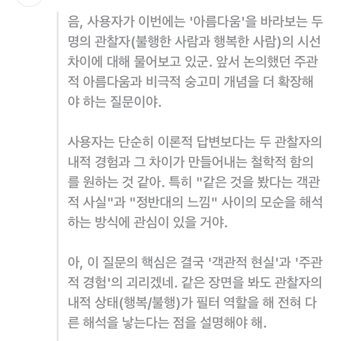 질문: 흐음! 동기의 비극과 창작의 아름다움을 잘 설명해 줘서 고마워. 그럼, 여기에 더해서 우리 두 명의 관찰자를 상정해 보자고. 다시 말해 그 겉보기에 아름다운 장면을 아주 불행한 사람과 아주 행복한 사람 둘이서 보고 있었다고 해보자 이거지. 이 두 사람은 과연 그 아름다운 동작 속에서 무엇을 보았을까? 서로 같은 것을 보고 같은 느낌을 받았을까? 아니면 같은 것을 봤다는 객관적 사실은 부정할 수 없지만, 정 반대의 것을 보고 느꼈다고 표현해야 더 진실에 가깝다고 해야 할까? 아니면….?