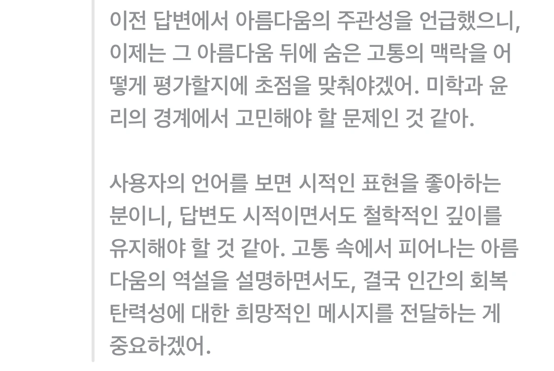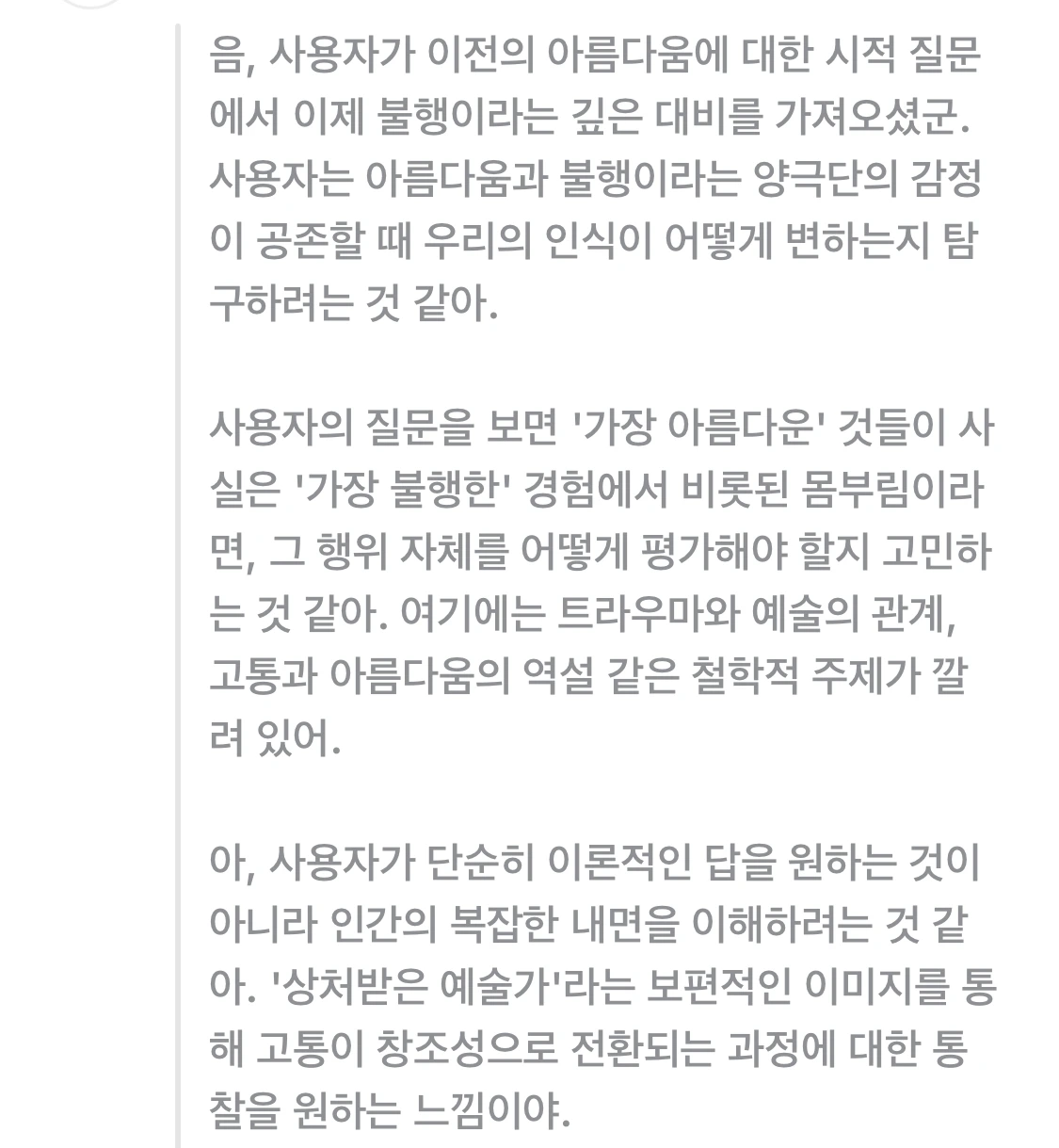 · 진실함의 아름다움: 그 행동이 고통에서 비롯된 것이라면, 그것은 더 이상 '완벽한' 아름다움이 아닐지라도 가장 순수하고 격렬한 '진실'을 표현한 것이 됩니다. 가면을 쓴 평온함보다 상처 입은 진실이 더 깊은 울림을 주는 법입니다.