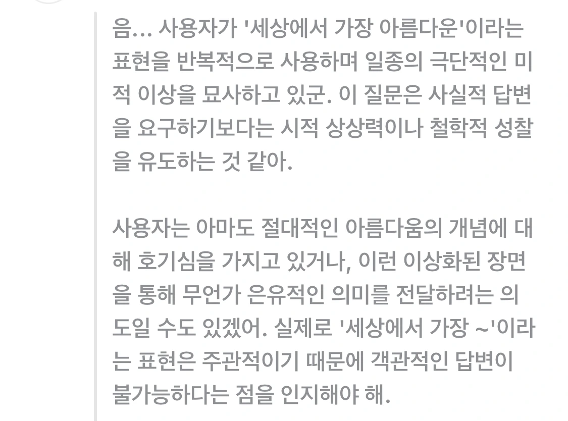 · 상상력의 힘: 이런 장면을 상상할 수 있는 당신의 마음이 이미 '세상에서 가장 아름다운 상상'을 하고 있는 것입니다. 이 질문은 결국 아름다움에 대한 동경과 완벽함에 대한 열망을 표현한 것이므로, 그 자체로 아름다운 시와 같습니다.