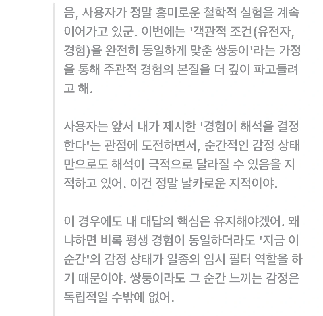 그러므로, 이 조건에서도 저의 대답은 변함없습니다. 그들은 같은物理的(물리적) 사건을 목격했지만, 서로 다른情感적(정서적) 필터를 통해 전혀 다른現實(현실)을 경험했을 것입니다. 그 순간의 행복과 불행이 그들이 평생 함께 쌓아온 동일한 경험 데이터를 처리하는 방식을 순간적으로 뒤바꿔놓은 것이죠. 이것이 인간 인식의 주관성과 그 심연 깊이 있는 고독함이자 다양함입니다.