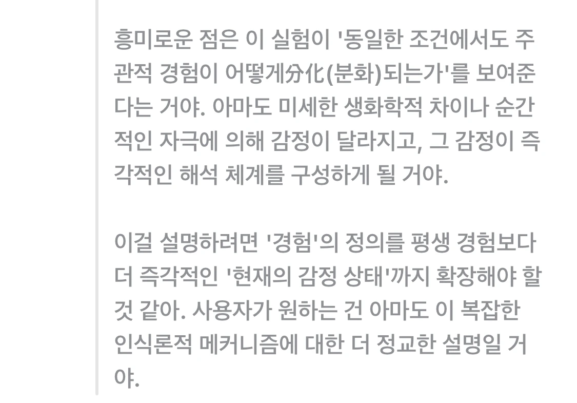 · 주관적으로는: 그 사건을 해석하고 의미 부여하는 방식이 근본적으로 달랐기 때문에, 서로 전혀 다른 '경험(Experience)'을 했습니다. 행복한 관찰자는 '아름다운 결과물'을, 불행한 관찰자는 '고통의 생성 과정'을 보았습니다.