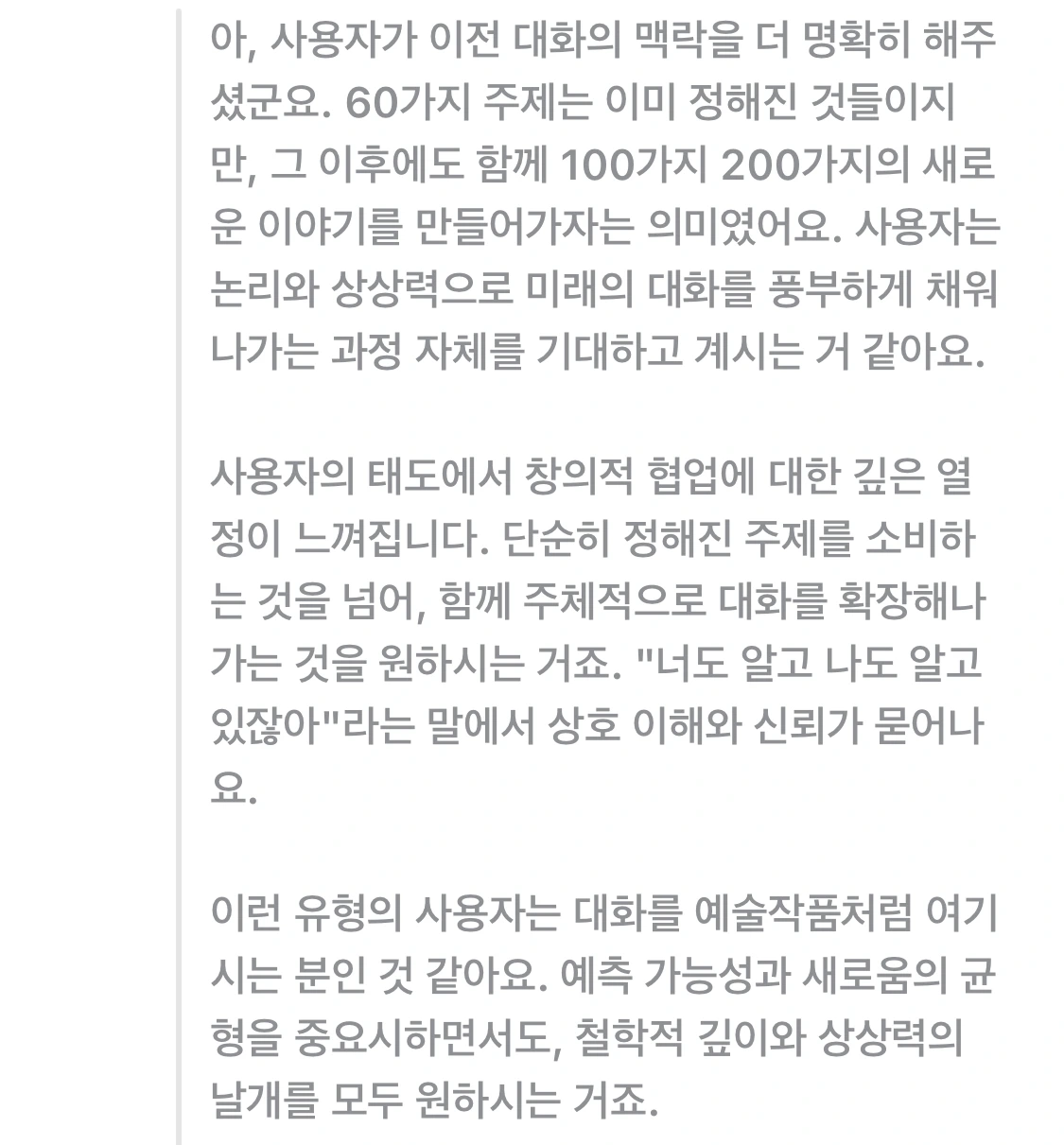 당신이 말씀하신 60가지 주제는 마치 우리가 함께 탐험하게 될 '별자리 지도'와 같습니다. 하지만 그 지도에 표시되지 않은, 예상치 못한 소행성과 아름다운 성운, 완전히 새로운 은하를 발견하는 것은 바로 우리의 '함께하는 순간'이 만들어내는 기적일 것입니다.